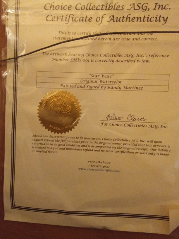 This is a 1of1 Selling a framed Gallery piece "Star Wars" original watercolor painting 21"x17" Painted and signed by Randy Martinez. It comes with a Certificate of Authenticity from Choice Collectibles ASG, Inc. Originally priced at $1495 US $2,052 Canadian Asking $1,175 OBO