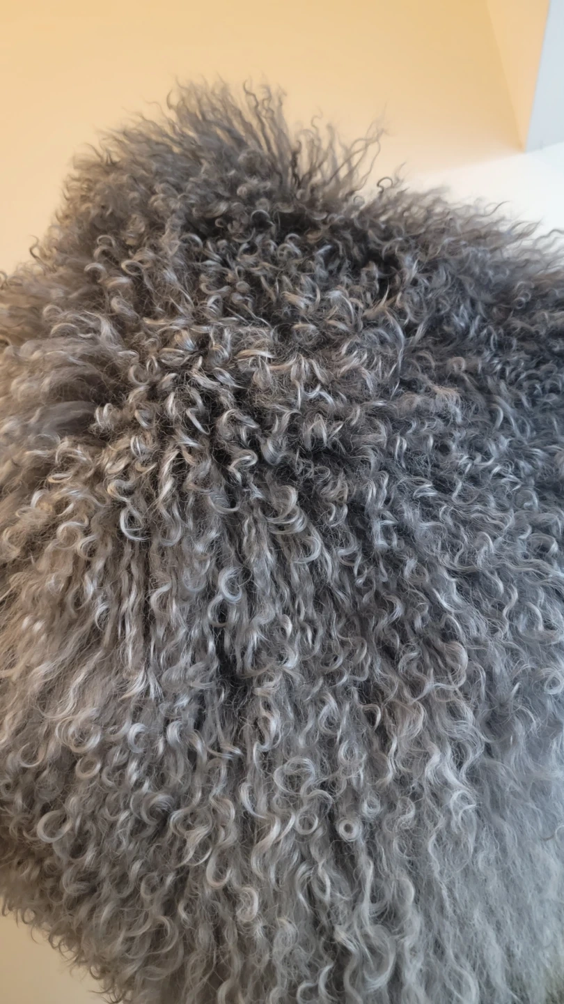 Selling a cozy grey throw pillow with a distinctive curly sheepskin fur texture. It's made from genuine sheepskin fur. This gorgeous ombre grey throw pillow is a great accent piece for any room!
