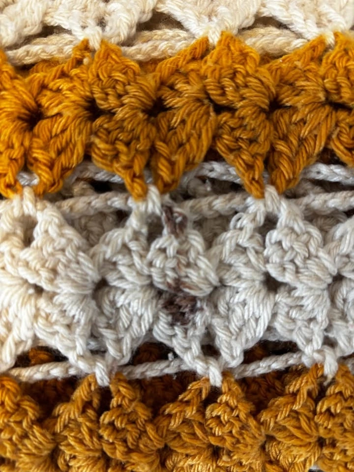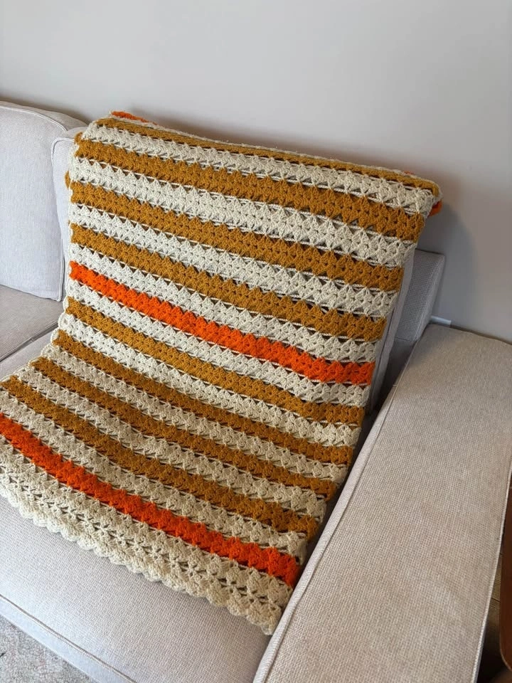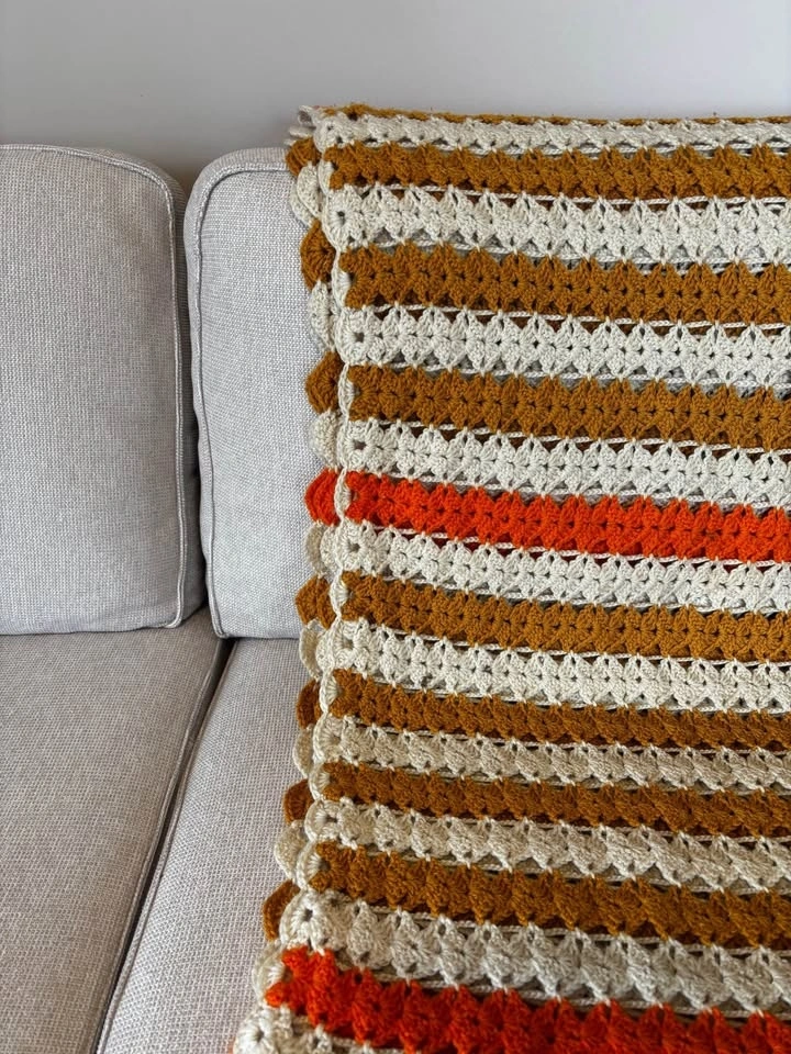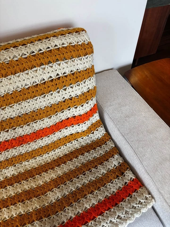 Really nice orange, white, and bronze knitted blanket, either a large throw or smaller bedspread. One small spot (shown in last pic) which was there when I bought it. Feel free to message if you have any questions!