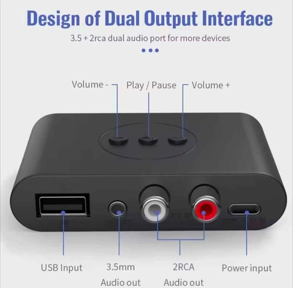 Brand New VAORLO BLS-B21 Bluetooth Audio Receiver. Connects via Bluetooth 5.2 and supports NFC pairing. Features U disk playback and hands-free calling. Output options include 3.5mm AUX and RCA stereo. Comes with a 3.5mm Aux Cable, Type-C Charge Cable, and RCA Cable. Pickup in Hamilton, ON.