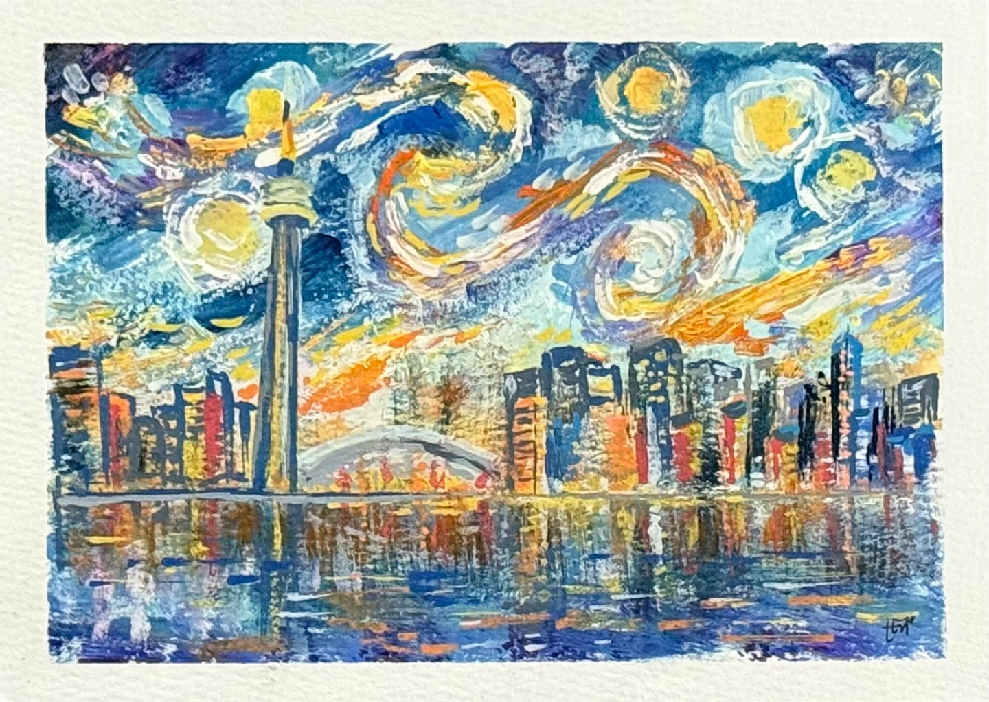 A unique mixed media (gouache and acrylic) painting on 5”X7” 300gsm watercolour paper featuring the Toronto skyline, including the CN Tower, in a style reminiscent of Van Gogh's Starry Night. It’s a combination of loose impasto style using gouache which adds texture in the background and foreground; juxtaposed with the more controlled lines and strokes of acrylics depicting the buildings and the lights reflected in the water below.