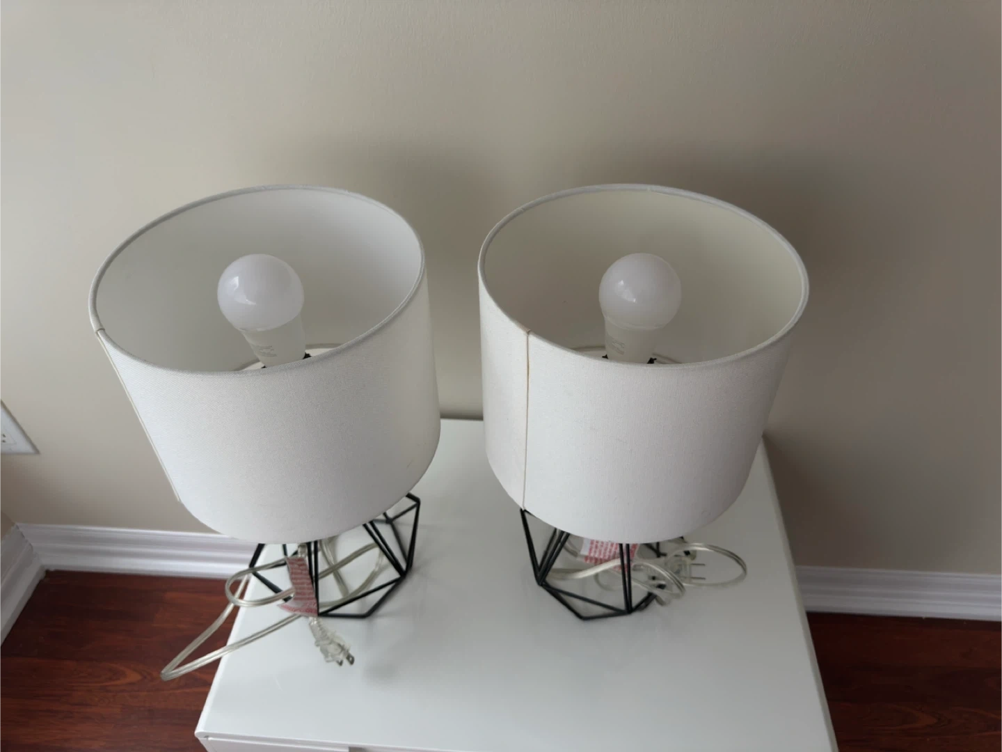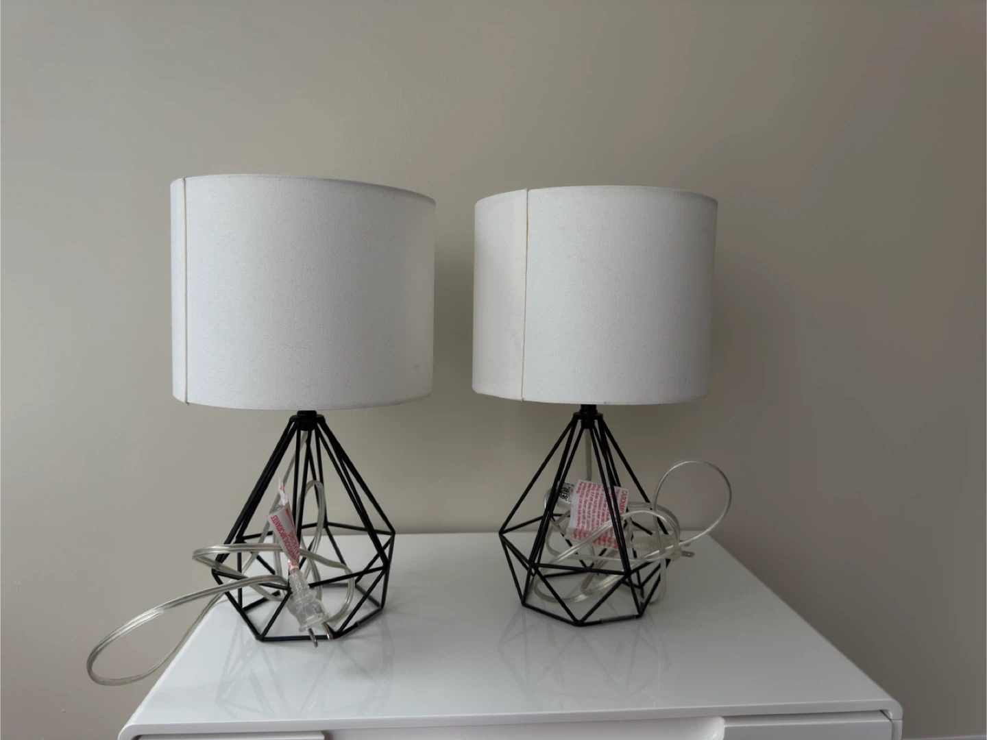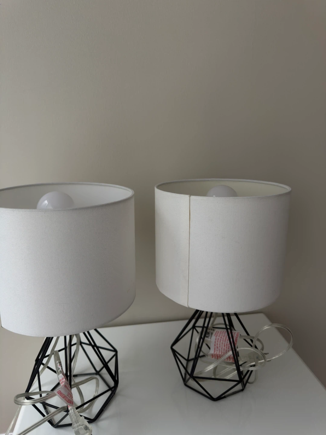 Set of two modern bedside lamps featuring a geometric black metal base and a white fabric drum shade. Each lamp includes a govee bulb. They're great as bedside tables or living room accent lighting! Height 16.8inches.
