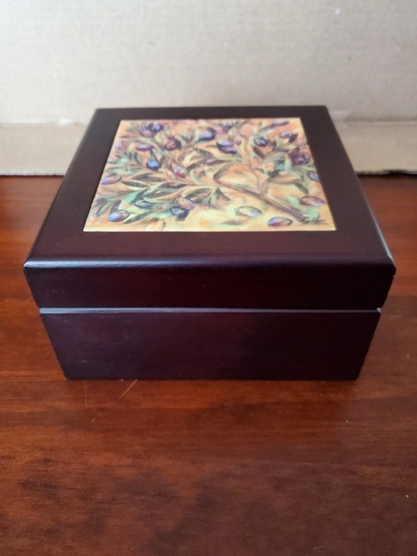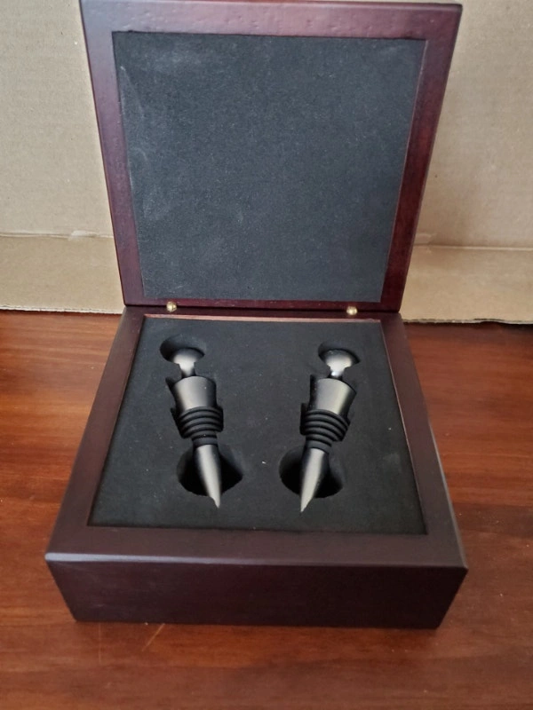 A nice wooden box containing a pair of bottle stoppers. The box has a ceramic tile insert and measures 5.5" x 5.5" -3". Asking $8.00, pick up only.