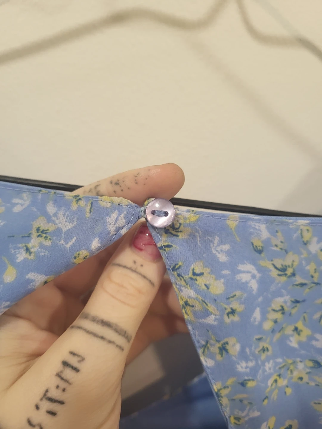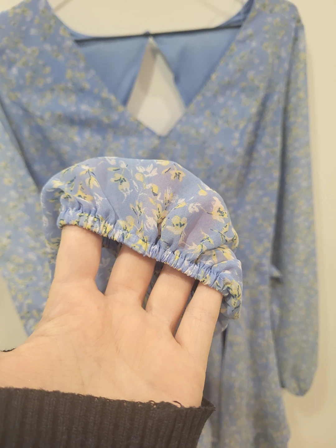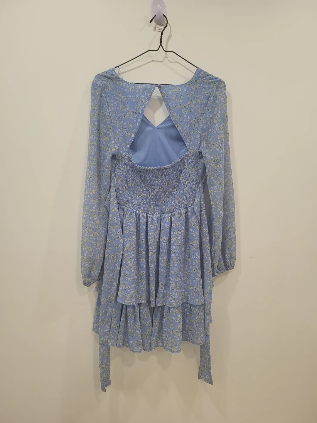 Selling a cute blue dress with a floral print! It has long sleeves and a tiered skirt. The back has a small opening and a button closure. Perfect for spring or summer!