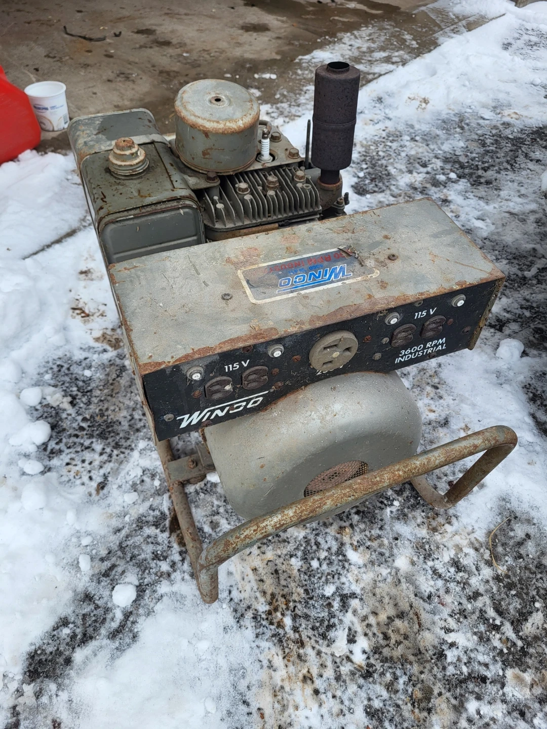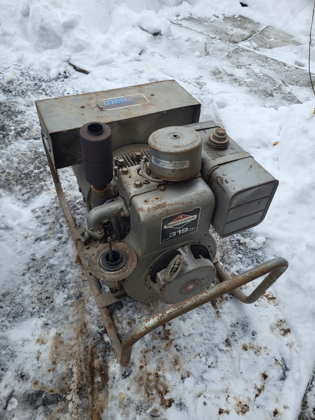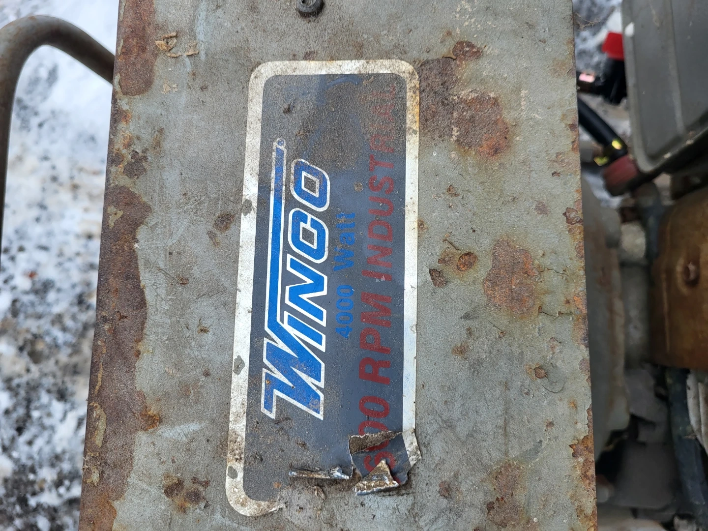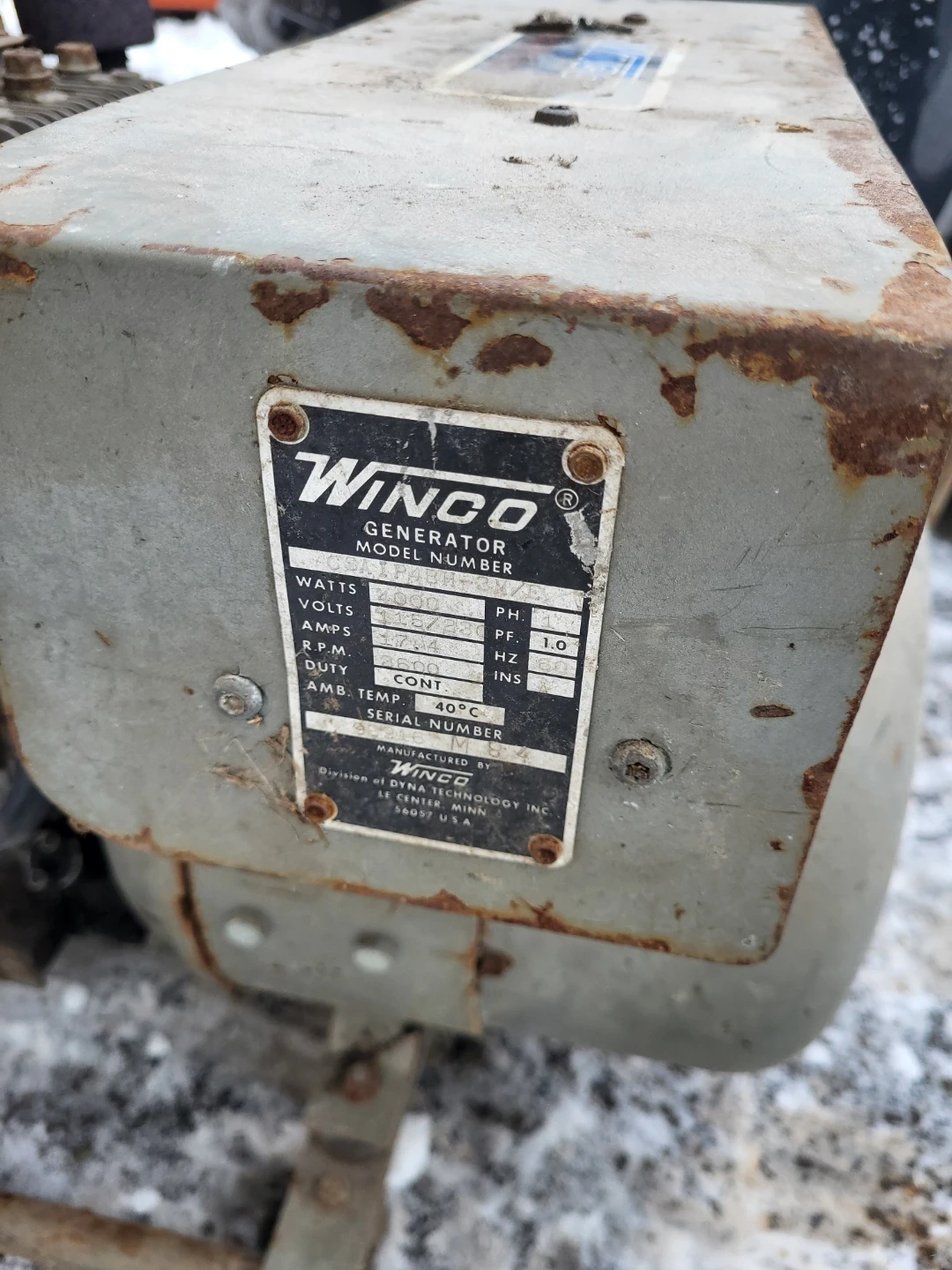 This is a Winco 4000 Watt generator with a Briggs & Stratton 319cc engine. It's rated for 115 V and 3500 RPM. Runs, and needs new air filter. Choke is very sensitive.