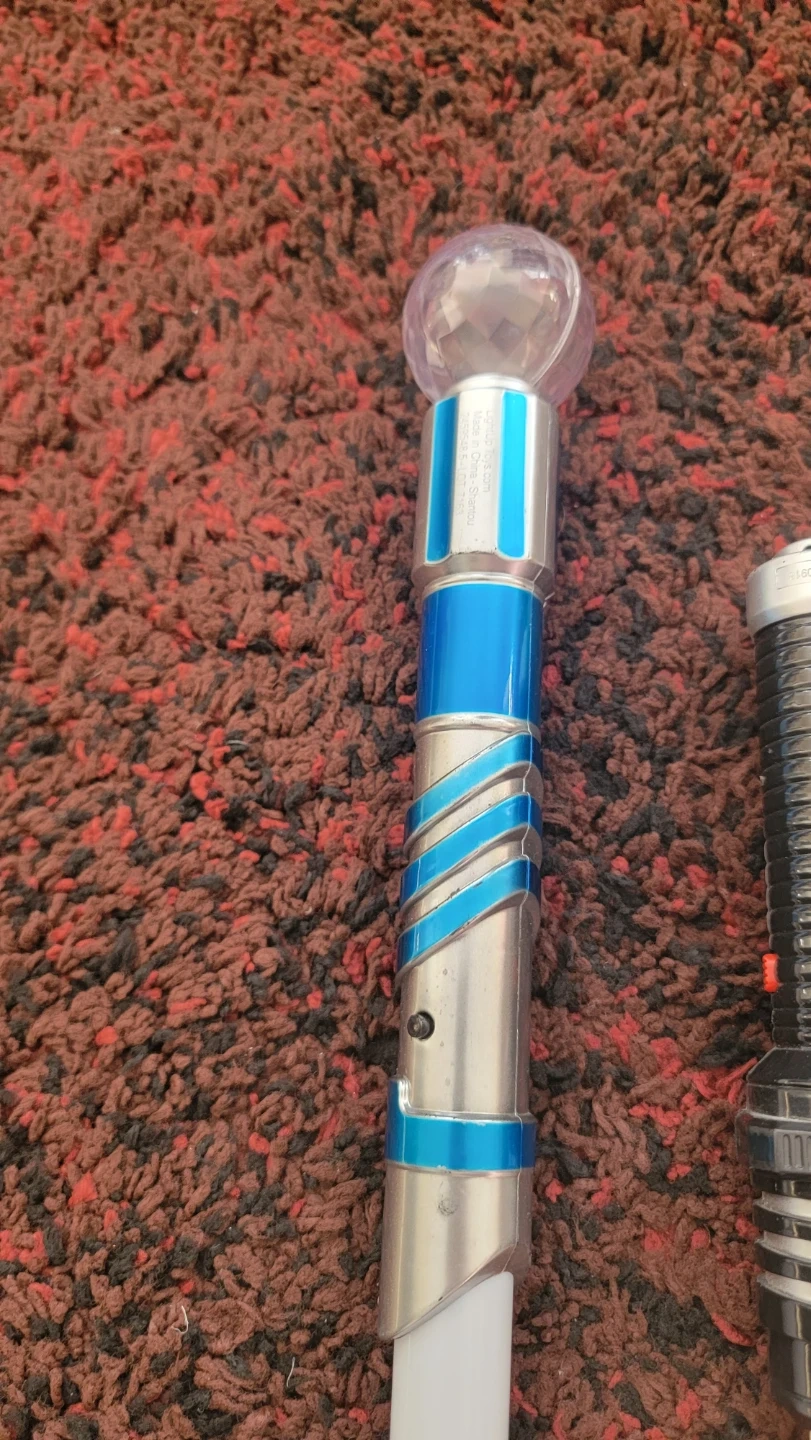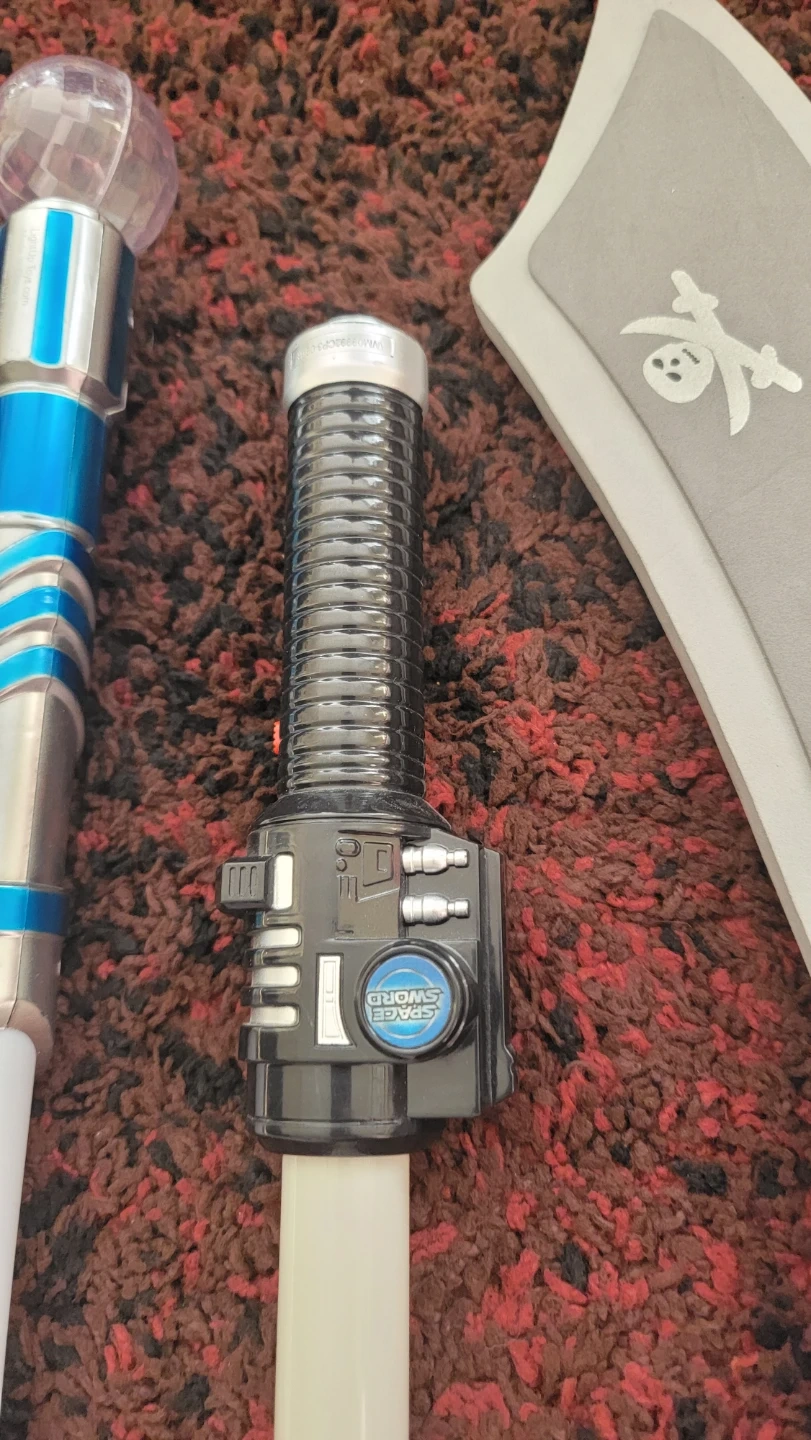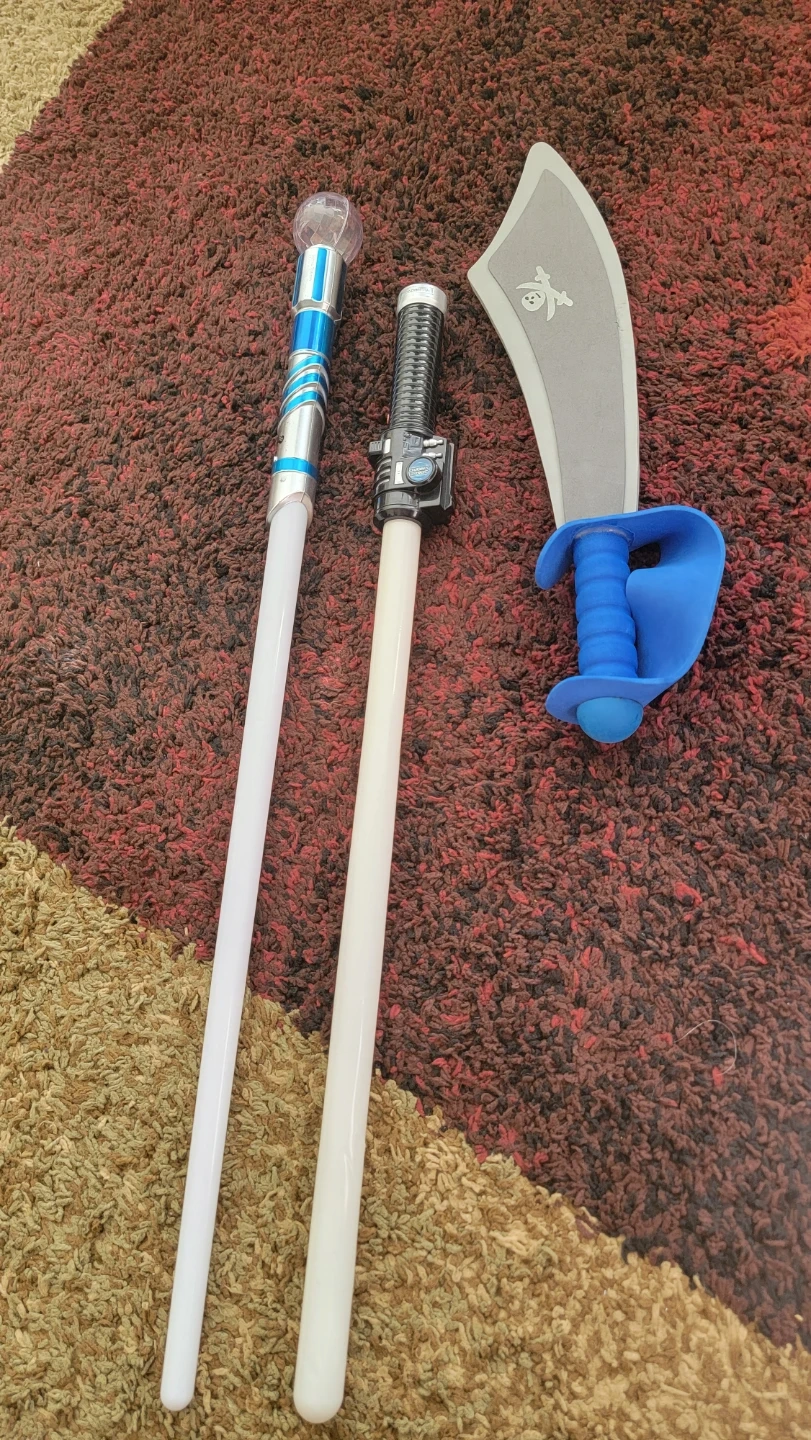 This set includes two toy lightsabers with light-up features and a plastic pirate sword. One lightsaber has a blue and silver handle with a crystal-like top. The other lightsaber has a black handle that says "SPACE SWORD". Fun for imaginative play!