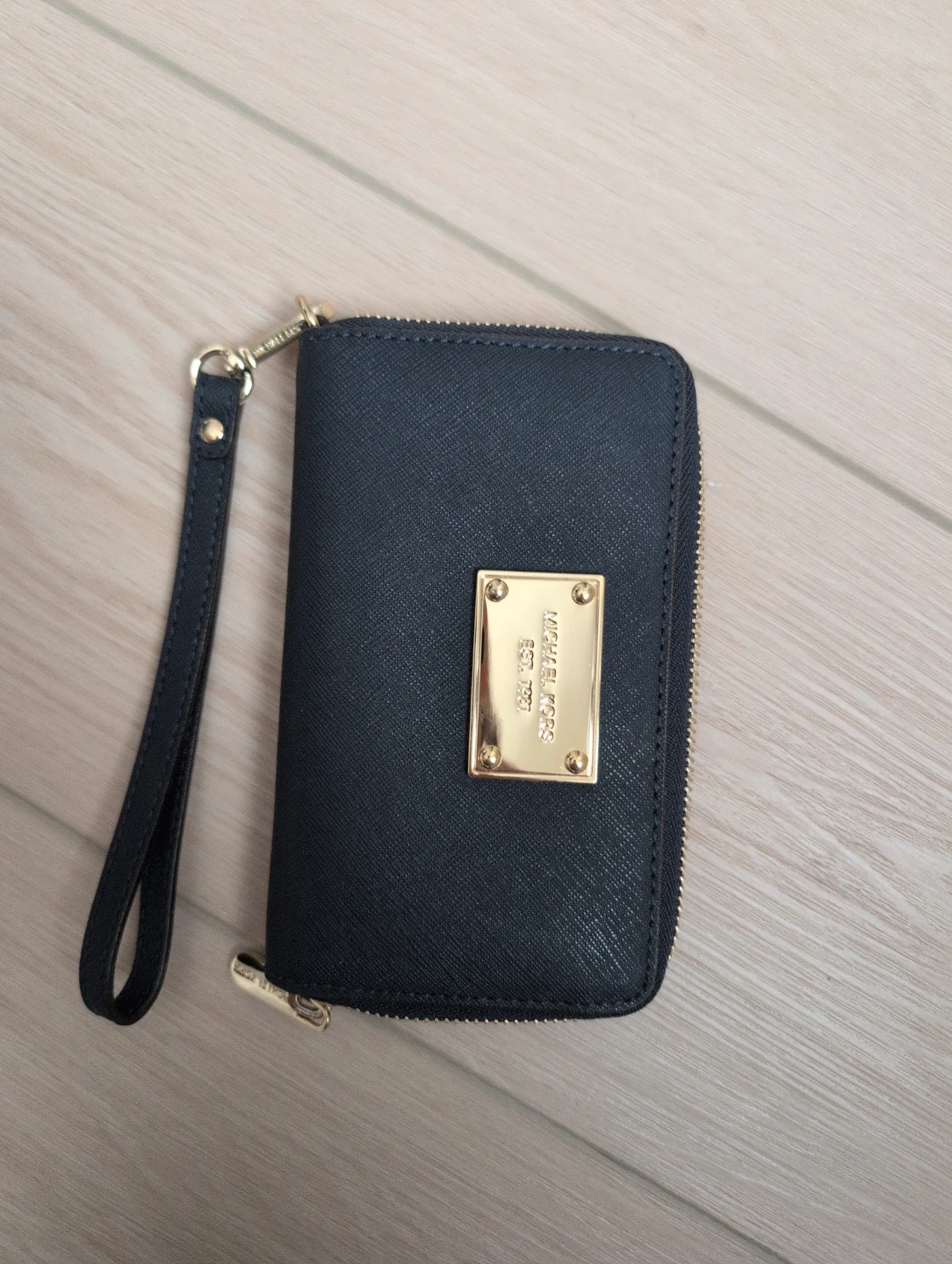 Navy Michael Kors wristlet wallet with gold hardware. It has multiple card slots and a zip-around closure. Wrist strap included.
