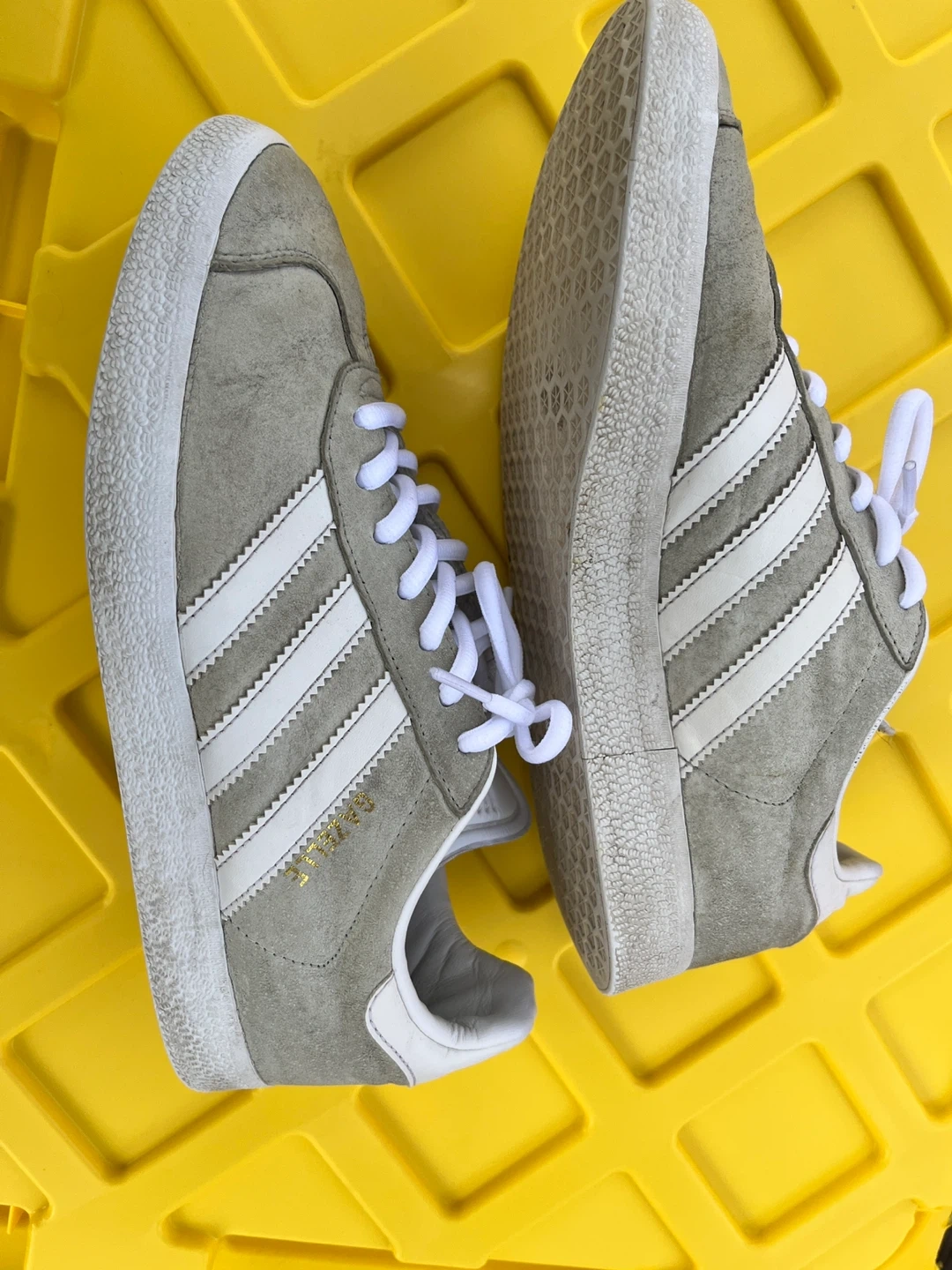Adidas Gazelle sneakers in grey with white stripes. Suede upper and rubber sole. Shows some signs of wear.