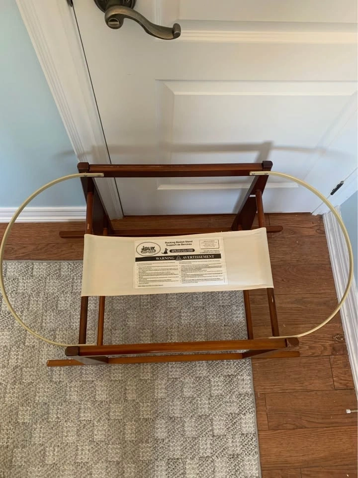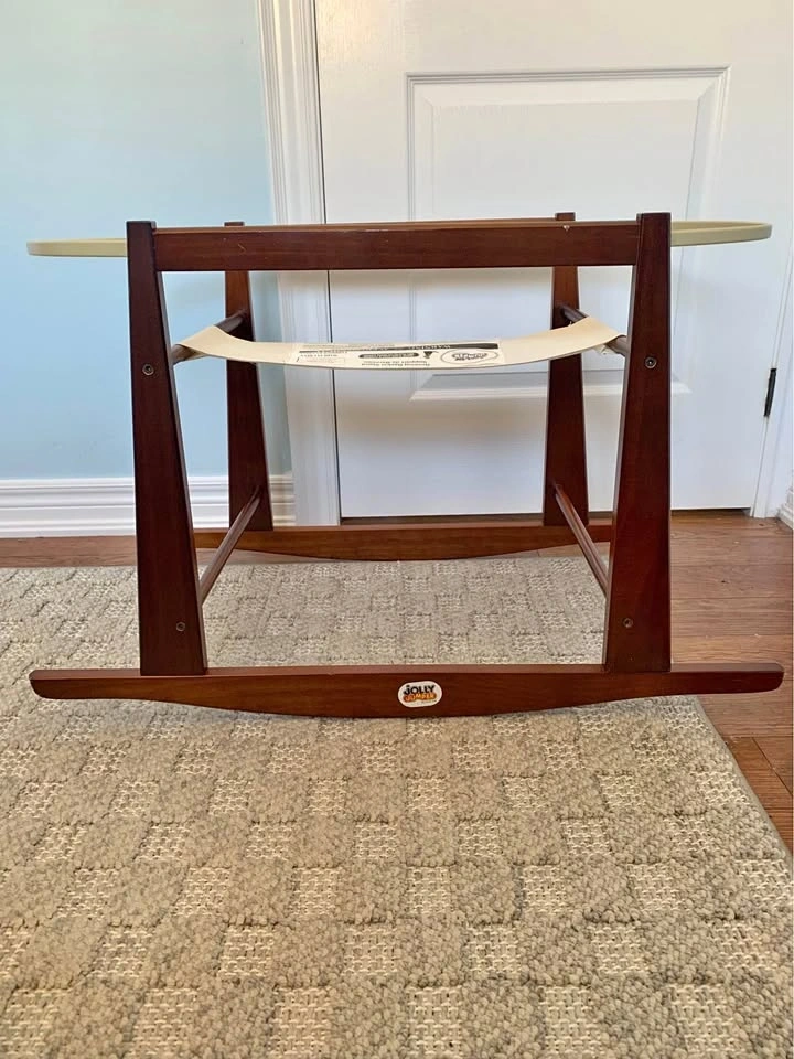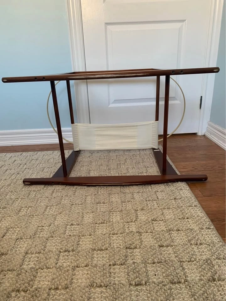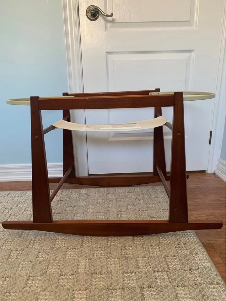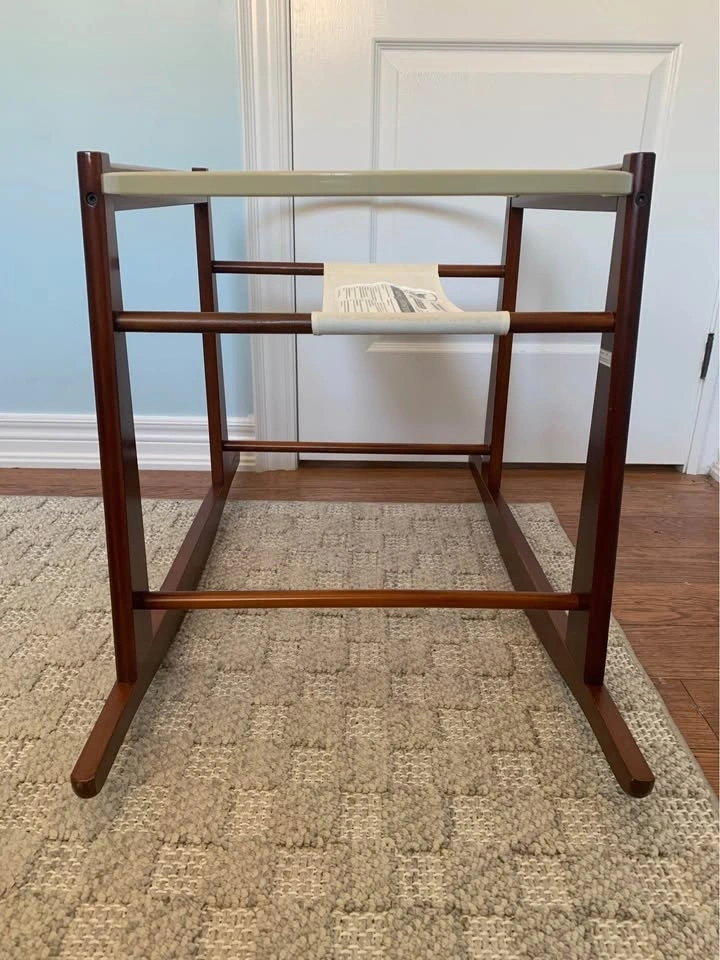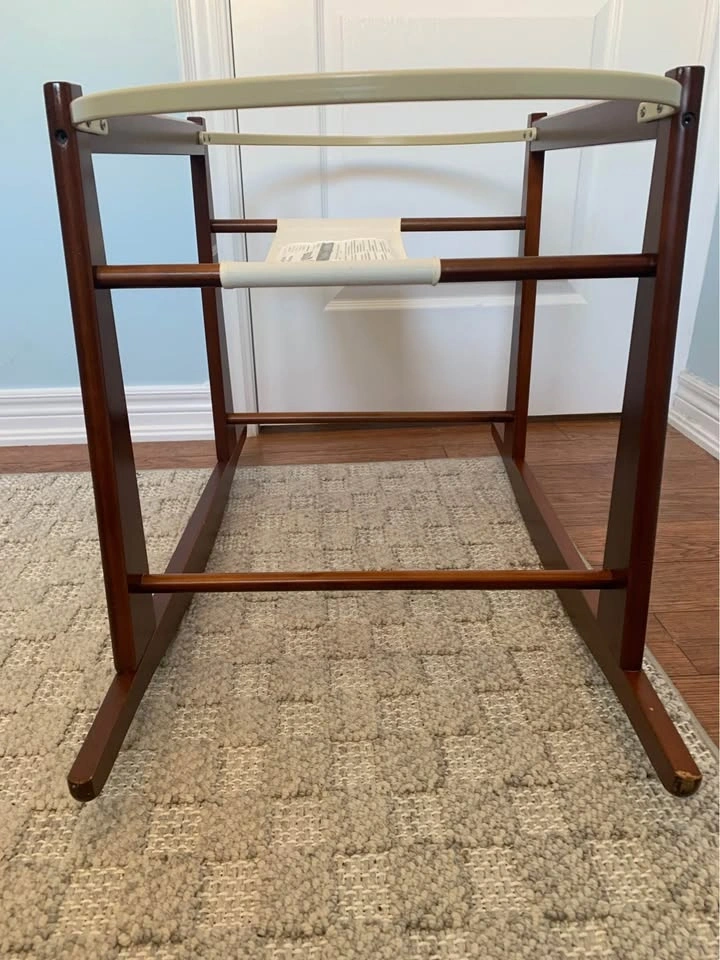 Perfect for soothing your baby with a gentle rocking motion. Can also be used upside down to eliminate the rocking. Great for nighttime, naps, or keeping baby close by during the day. Some wear and tear (scratches) on the bottom from rubbing against the floor during rocking, but this does not impact functionality at all. Still in perfect shape and very safe to use – we used it as of two weeks ago. Baby has now grown out of the bassinet so it's no longer needed. Could also sand it down and repaint/stain if you want to change the color. Bassinet not included. Smoke-free home.