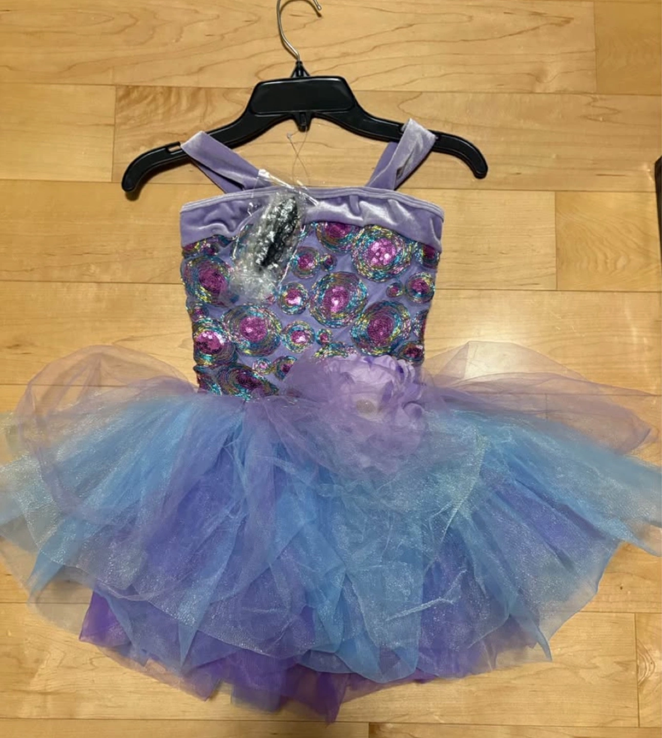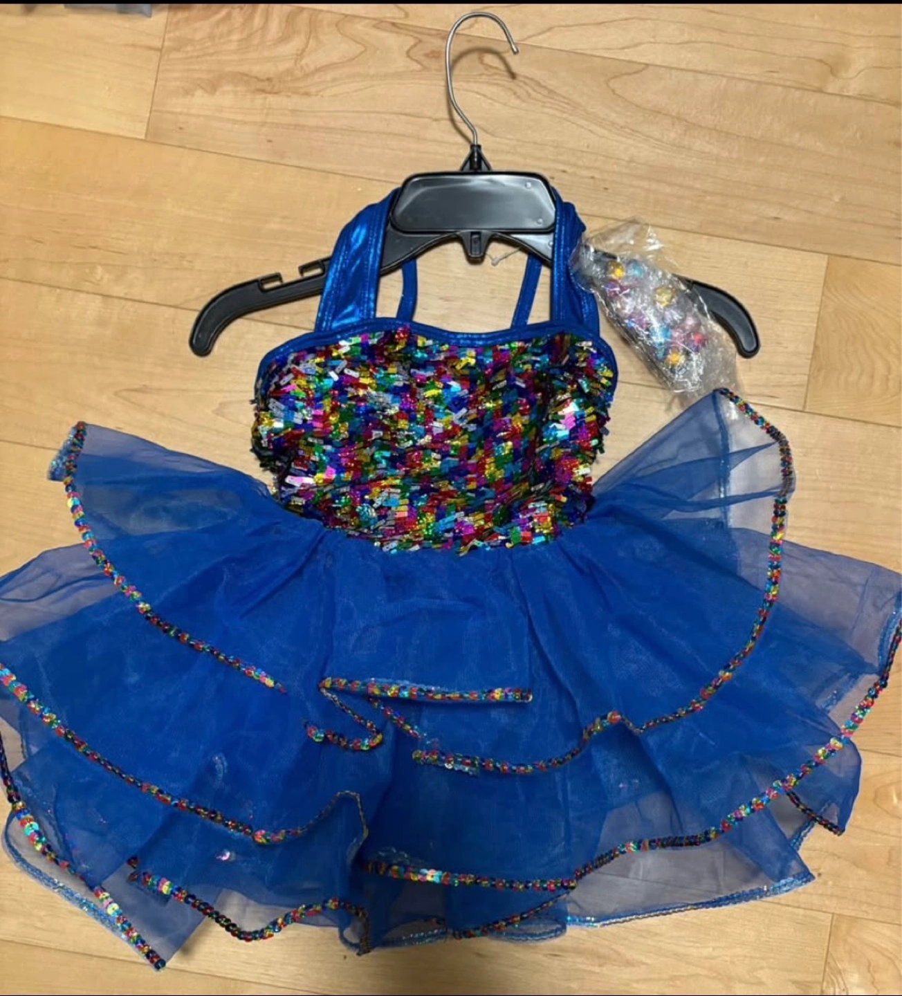 Adorable girls' dance costume. Features a vibrant sequined bodice and layered tulle skirt. Perfect for performances or recitals. Includes additional hair accessories. Size 5-7T