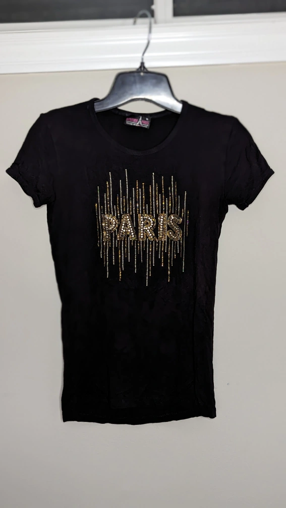 Well loved Paris t-shirt. Lots of life left in it, just no longer fits. Hoping could bring joy to someone else.