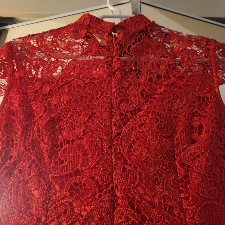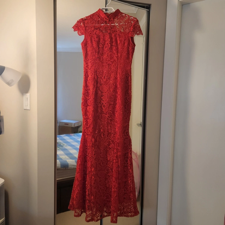 Red lace dress for tea ceremony. Street size 4. Wore it for less than an hour. Selling it for $80. For reference: I'm 5 feet tall and I was barefoot during the ceremony.