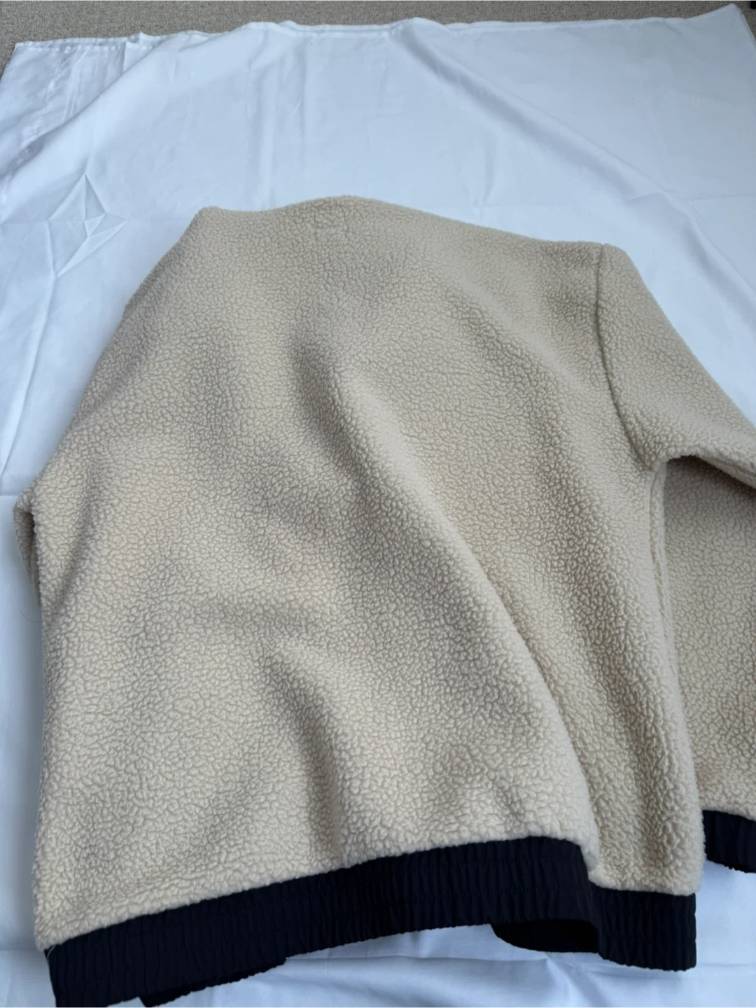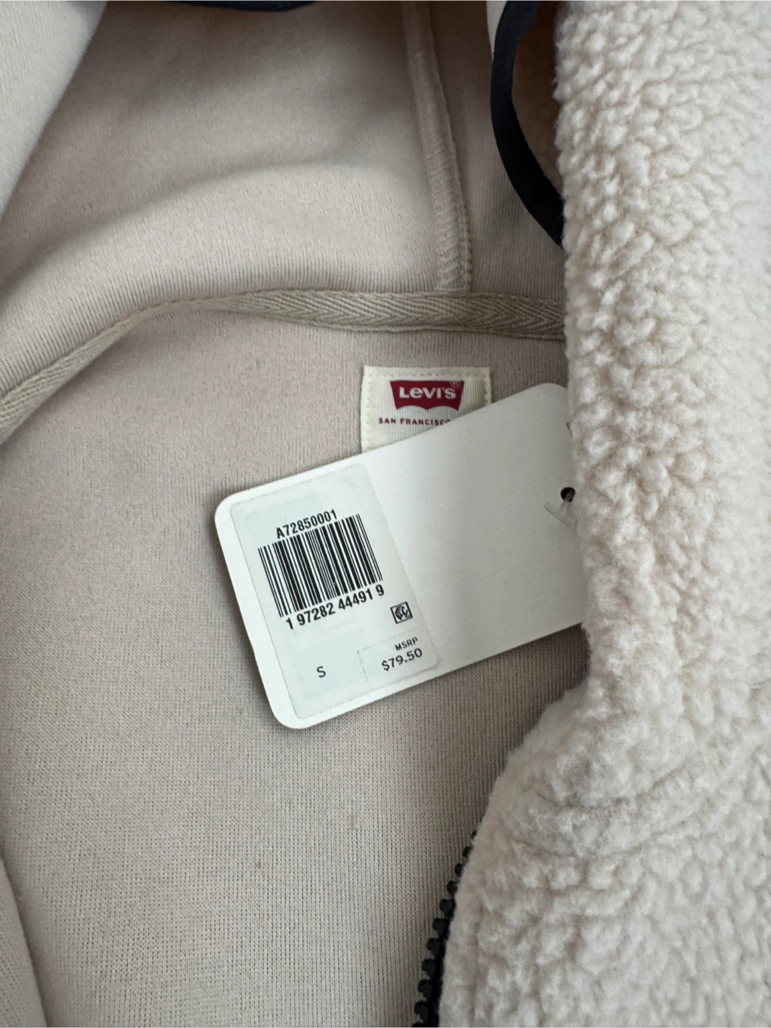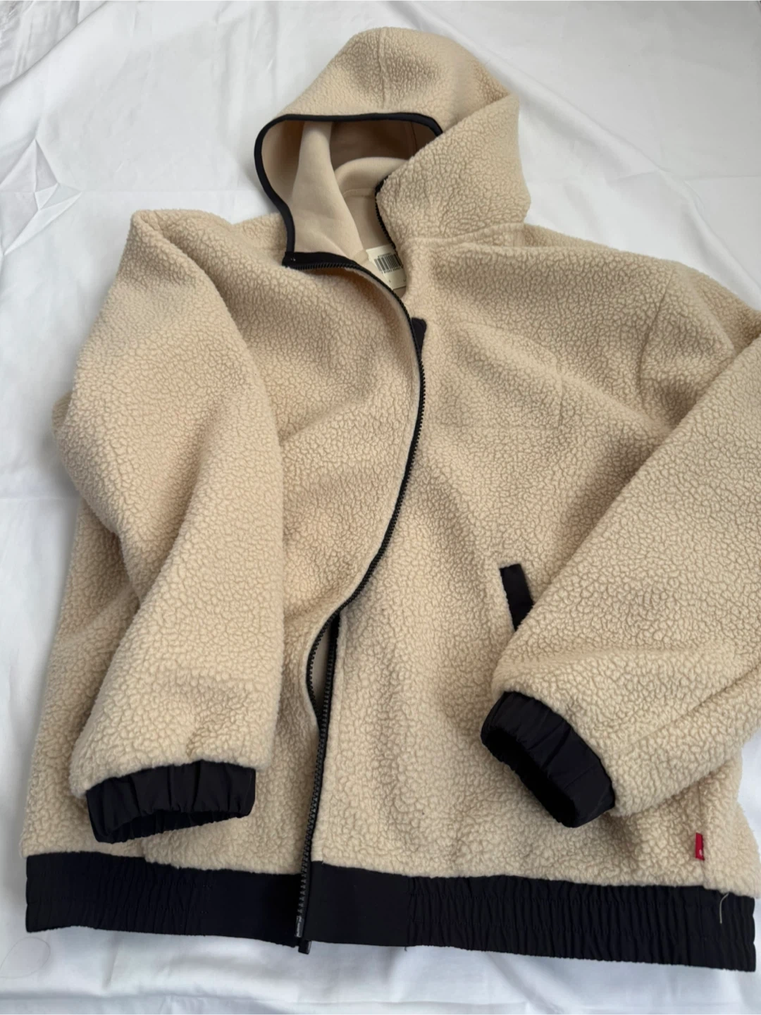 This is a Levi's sherpa fleece hooded jacket. It's beige and features black trim and zippers. Size is small.