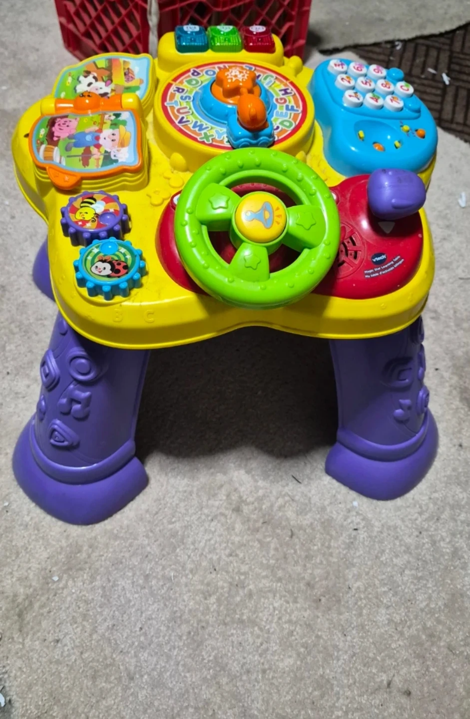 This VTech Magic Star Learning Table offers interactive play with various activities. It features a steering wheel, telephone, and learning gears. Designed for little ones to explore and learn through play!