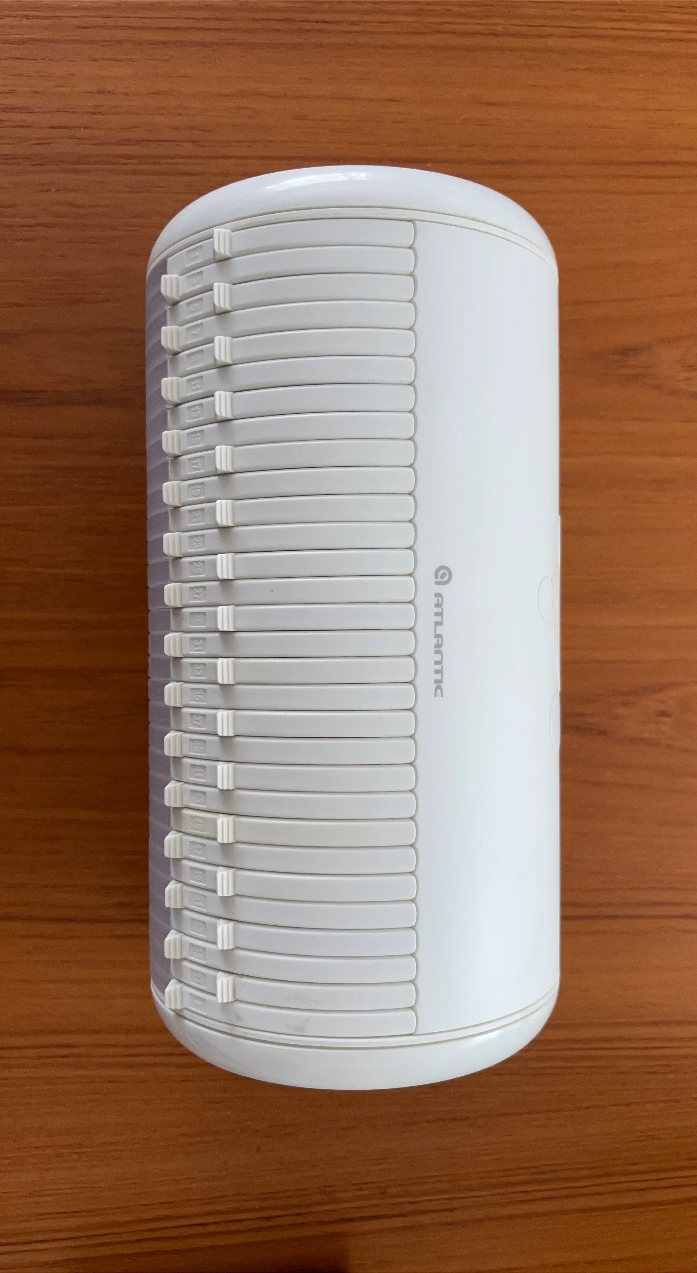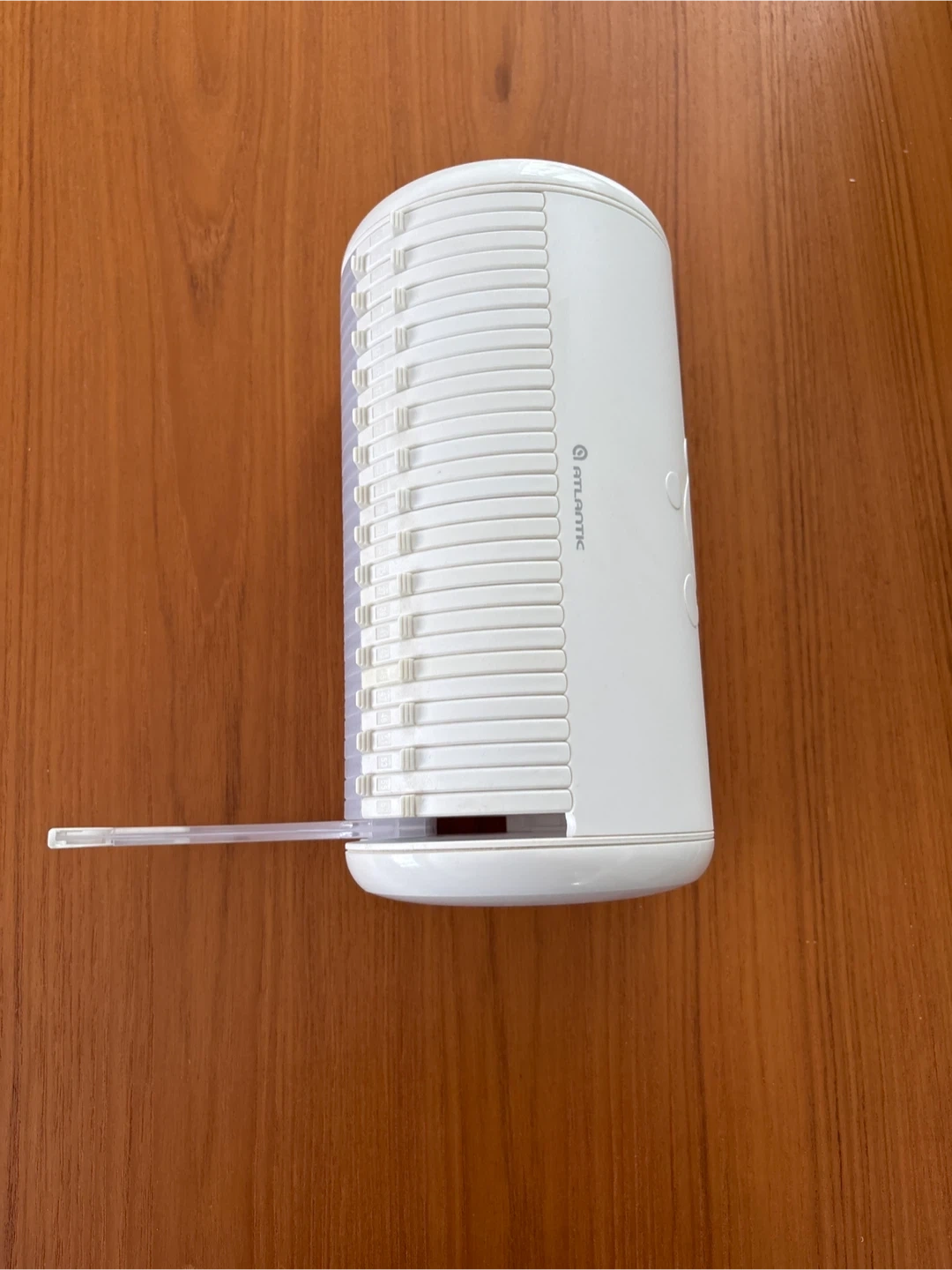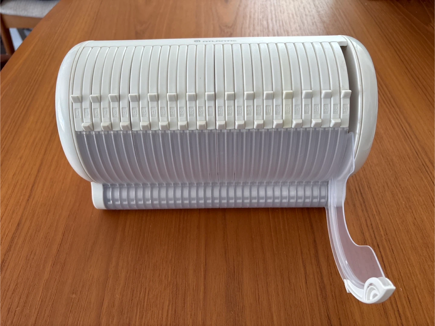 Atlantic spinner horizontal tower holds up to 60 CDs or DVDs. It's made of durable white plastic with a clear plastic handle for easy turning. Keeps your discs organized and accessible!