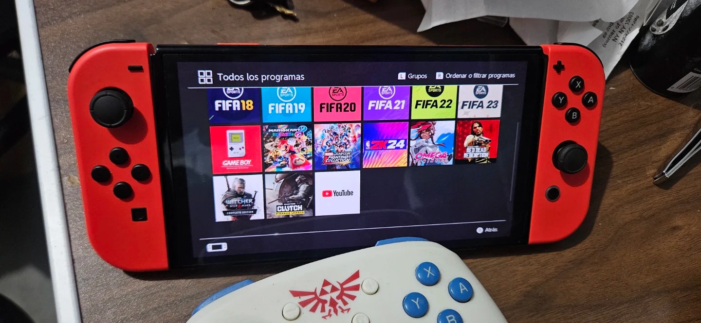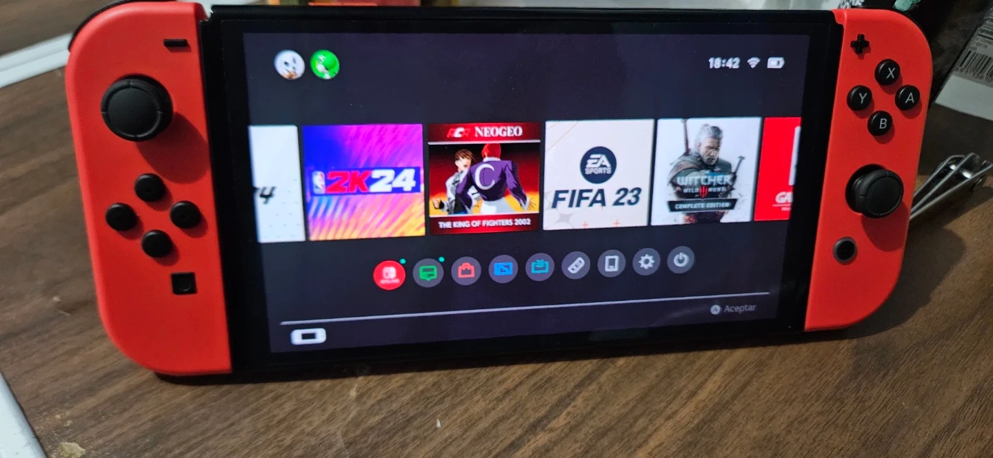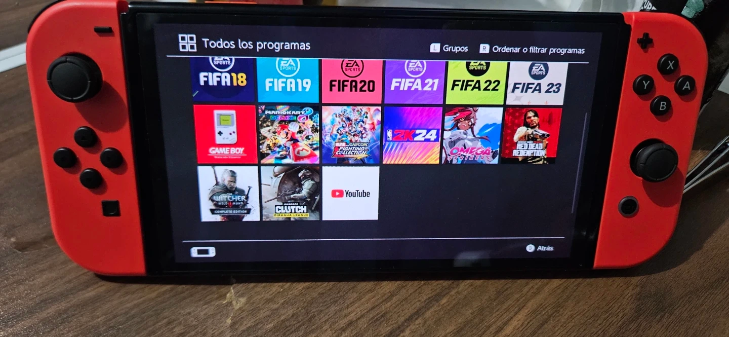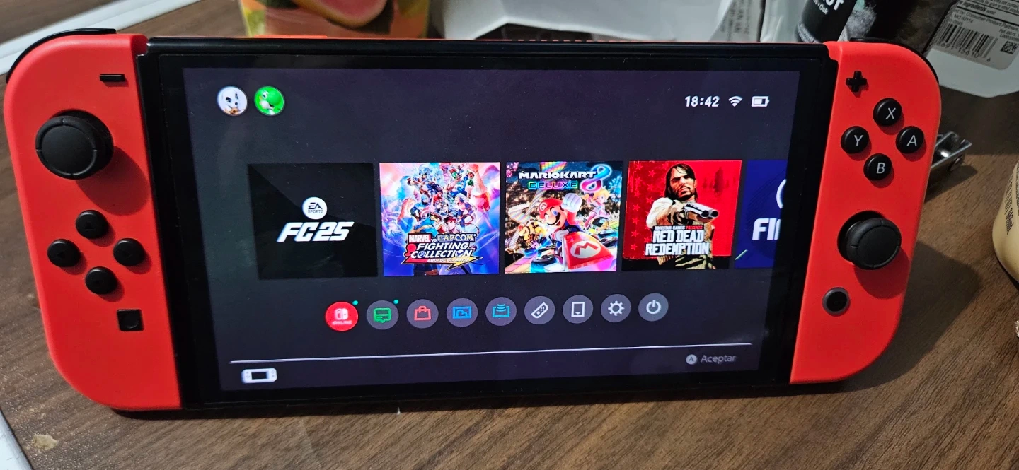 Red Nintendo Switch console. It's a handheld gaming device with a vibrant screen. Includes multiple games like FIFA and Mario Kart.