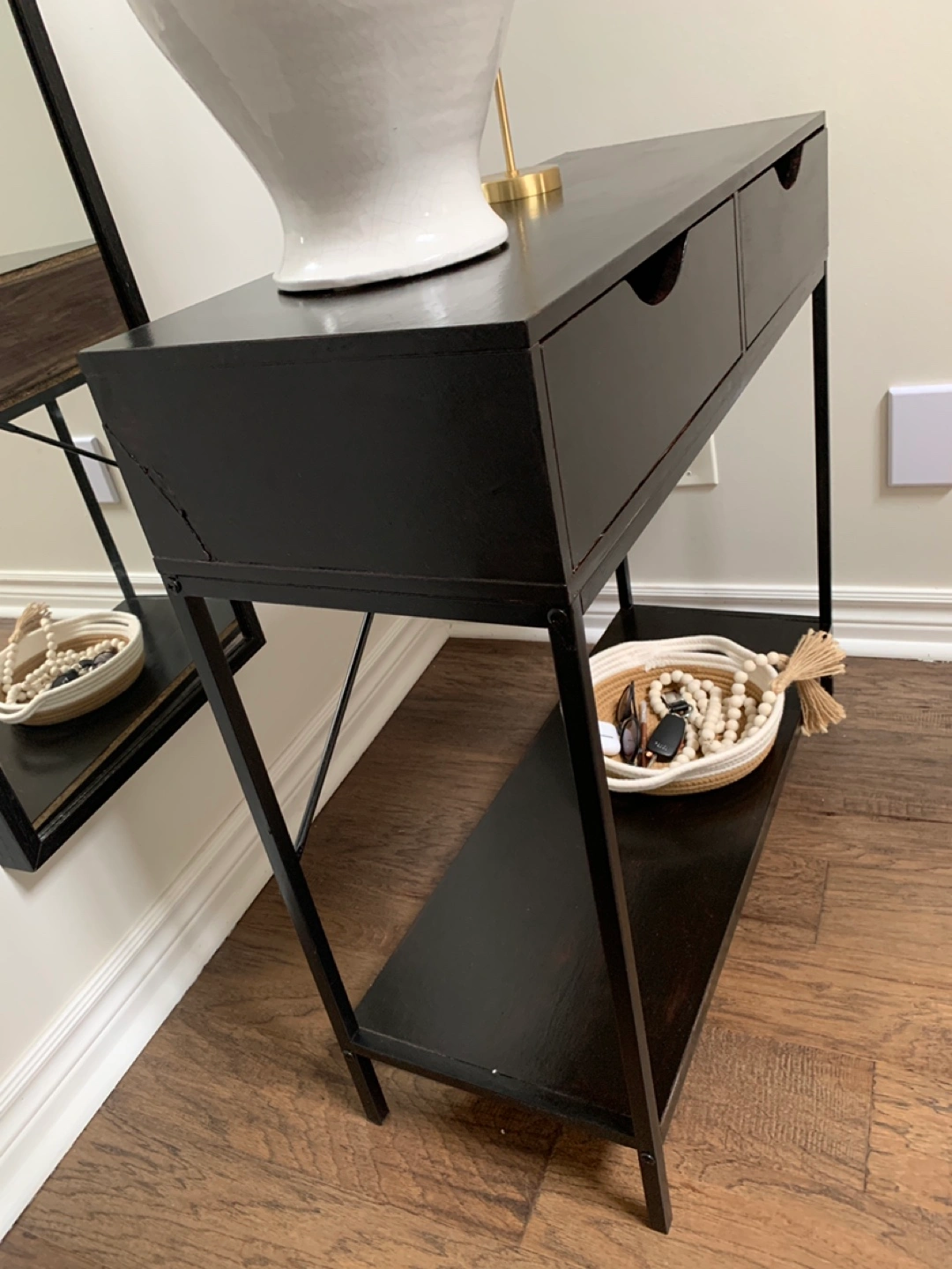 2 Tier Console Table for Entryway Black Metal Frame With two wooden Drawers and shelf