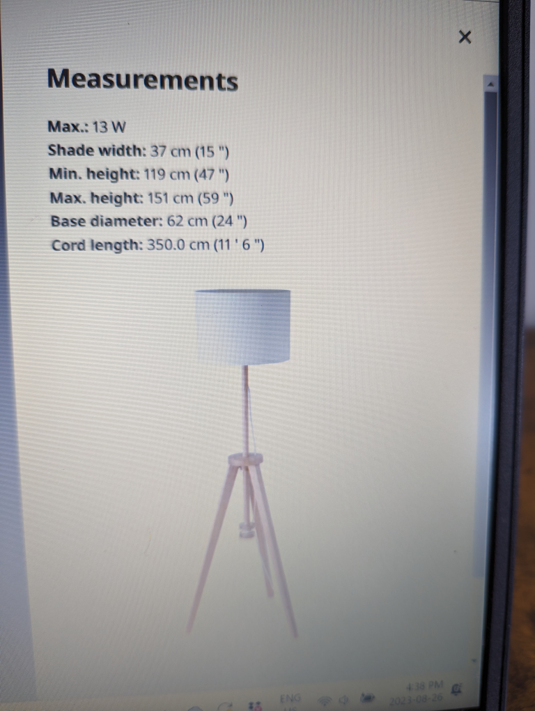 1 / 81 / 8Buy & SellIkea lamp LautersIkea lamp Lauters$60Ash and white floor lamp from Ikea. Like new. Looks great in any space. Moving sale. Dimensions13"W x 47 to 59"TWHERE TO MEET125 Lawton BlvdView MapSELLERJMPYonge St.Clair946 reviews2 chats·3 favorites·67 viewsSEND CHAT TO SELLERHi JMP! I’m interested in your listing.Hi JMP! I’m interested in your listing.Get the Karrot app to chatSign In to chat