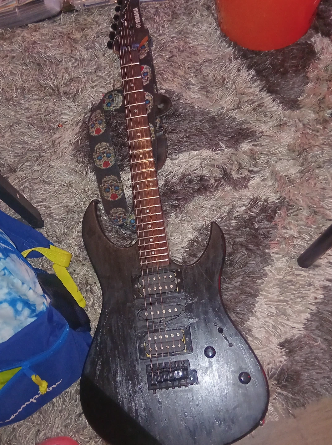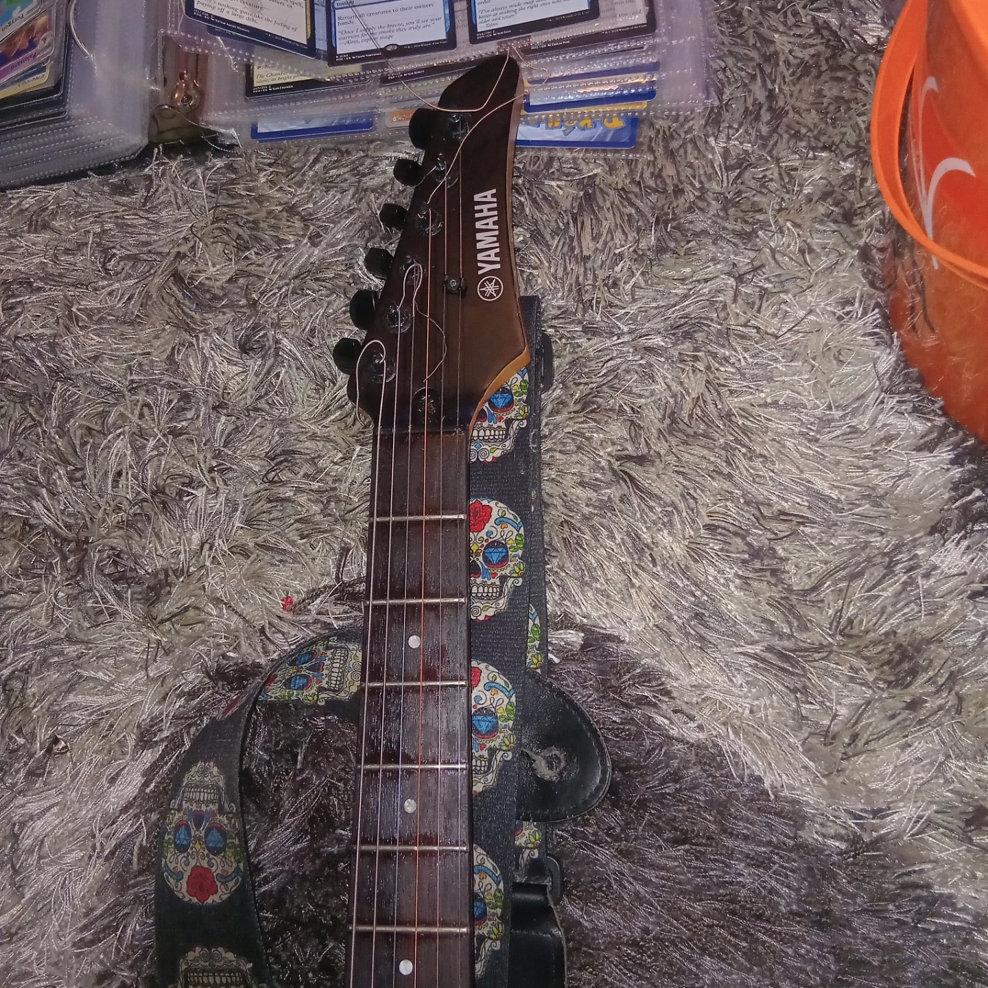 Yamaha electric guitar with a skull-patterned strap. It's black and comes with a strap. This guitar is ready for practice or performance!