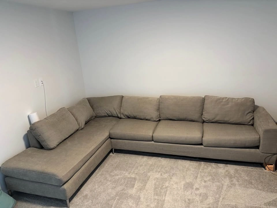 Great condition gray L-shaped sectional couch. 11 ft long side, 7 ft short side, 3 ft deep. Comfortable and clean, with plump cushions. $400 obo