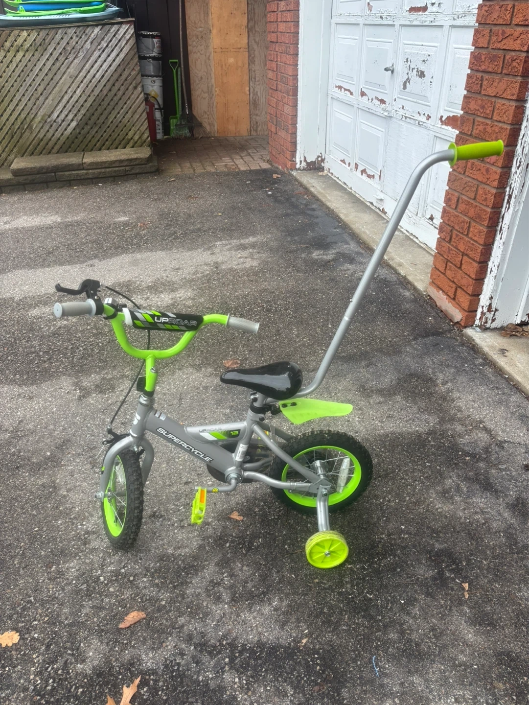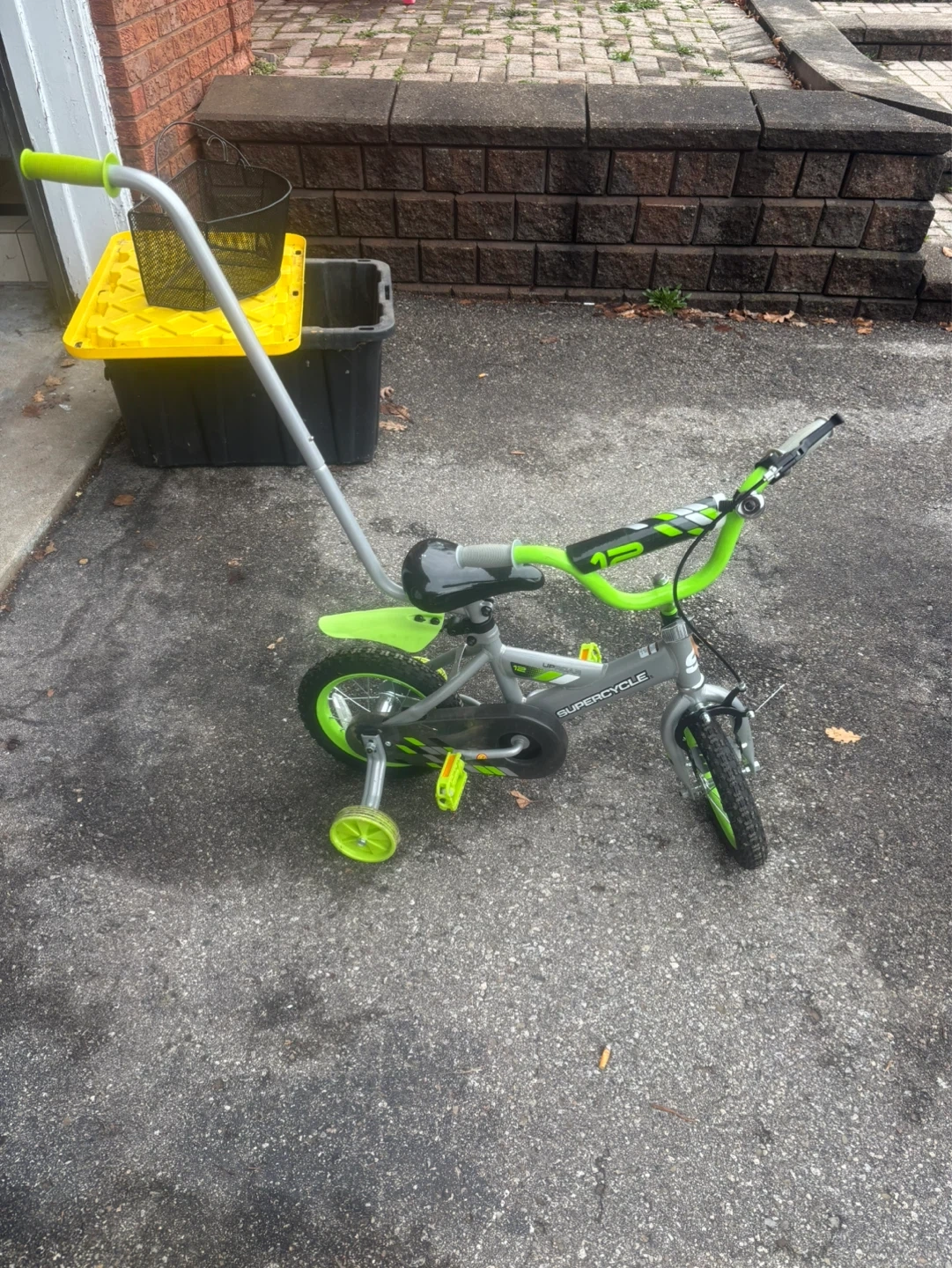 This SUPERCYCLE kids' bike is grey and green with training wheels and a parent push handle. It's designed for young riders learning to balance. The adjustable seat ensures a comfortable fit. Great for getting kids outside!