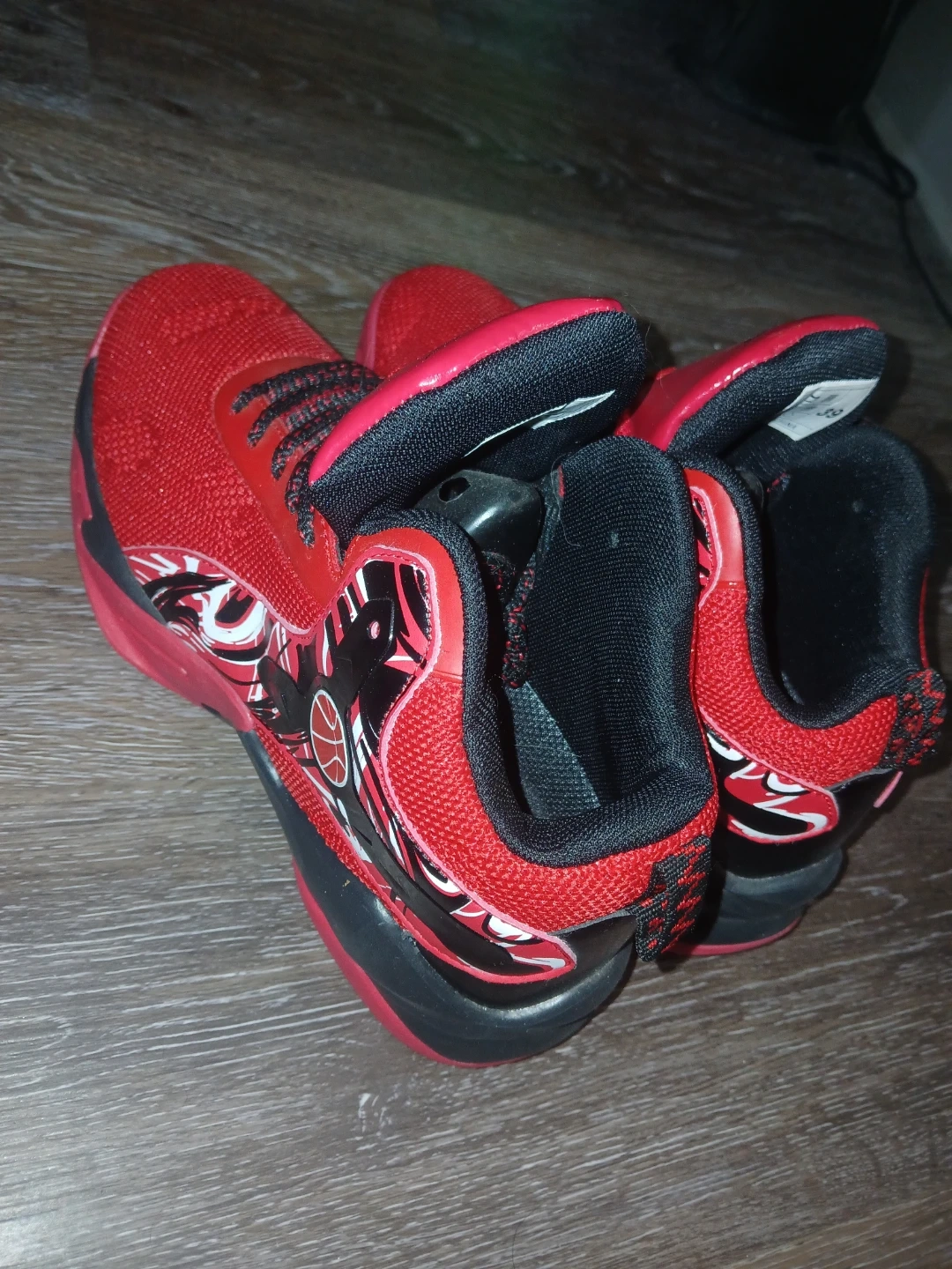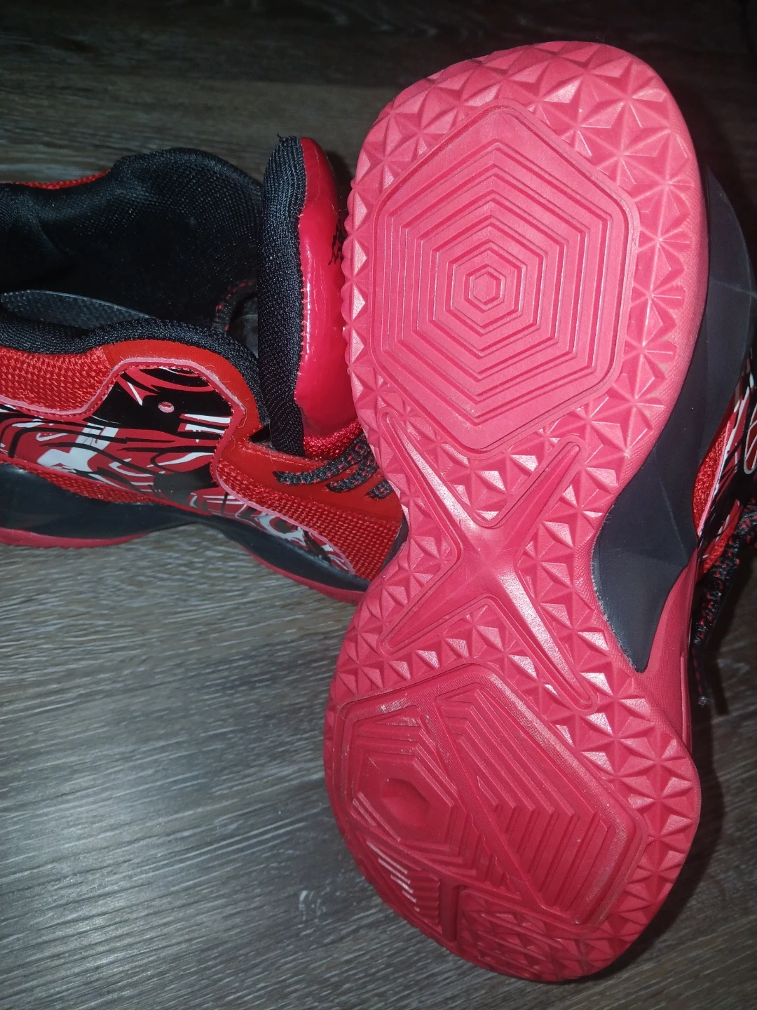 These are red mid-top basketball shoes with black accents. They have a mesh toe box and a grippy rubber sole for traction. Laces are black. A basketball graphic with flames is on the side.