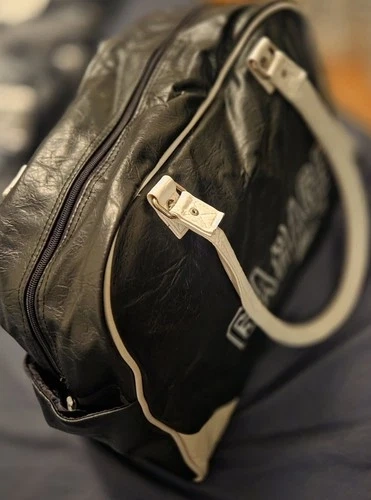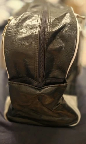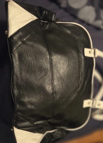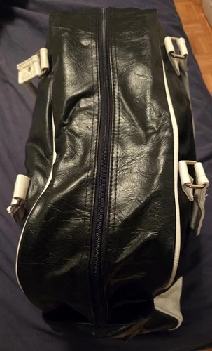 Crafted from premium faux leather, this duffle bag boasts a sleek black and white color scheme. Featuring multiple compartments to keep personal items neatly arranged. Used once, small signs of age on handles, but looks excellent. Vintage purchase around 2005.