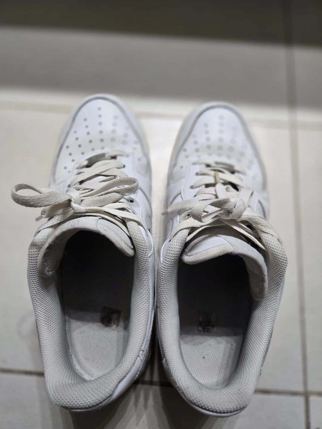Classic white Nike Air Force 1 Low sneakers. Leather upper with lace-up closure. Iconic design for everyday wear. Shows some signs of use.