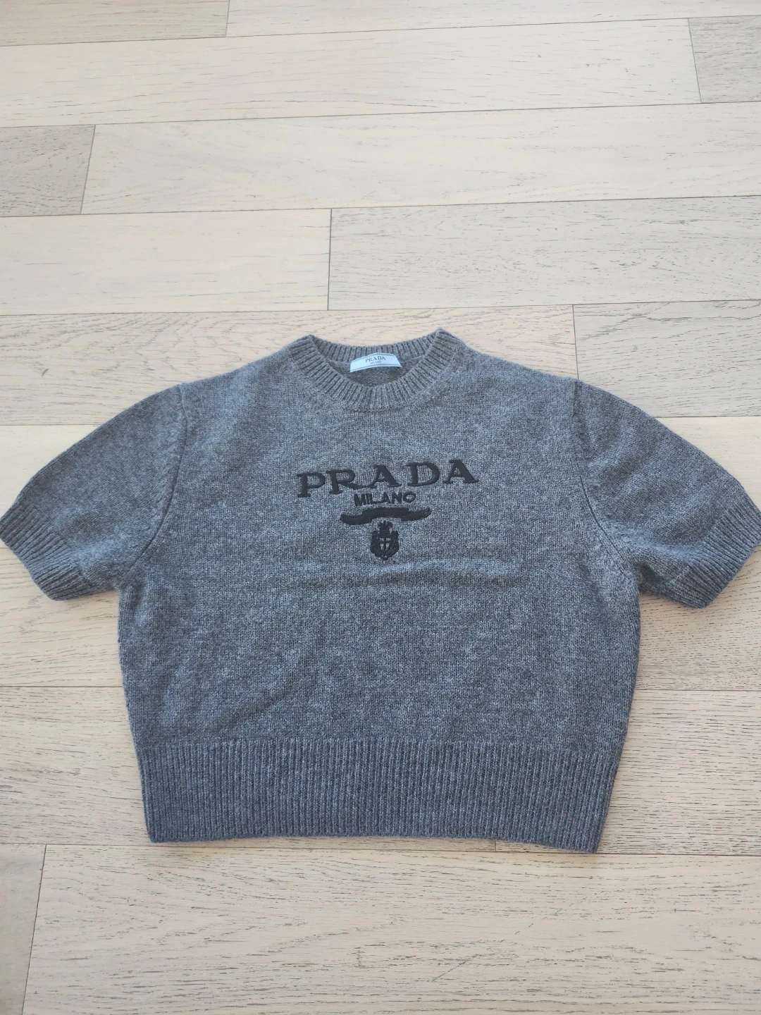 This is a Prada Milano short sleeve knit sweater in grey. It features the Prada logo embroidered on the front. Made from a soft, comfortable material.