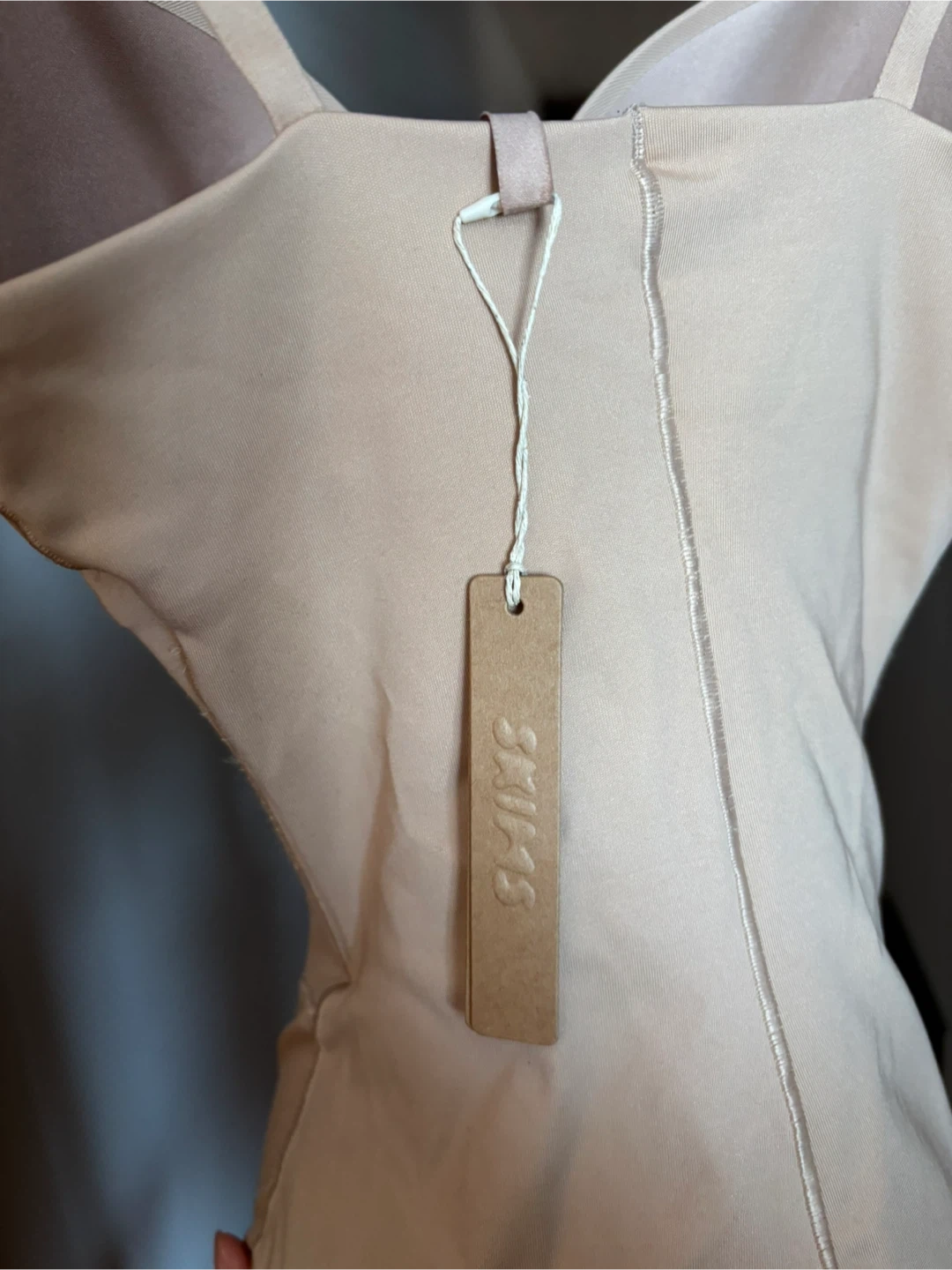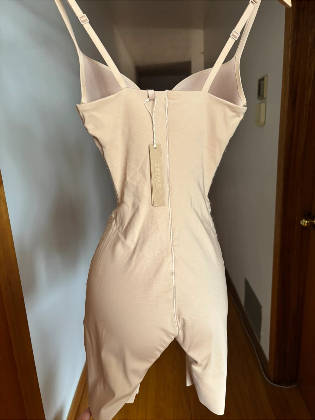 SKIMS sculpting bodysuit: push-up enhancing padded mid thigh bodysuit. It has adjustable straps and a built-in bra. Made with a comfortable, stretchy material for a smooth finish.