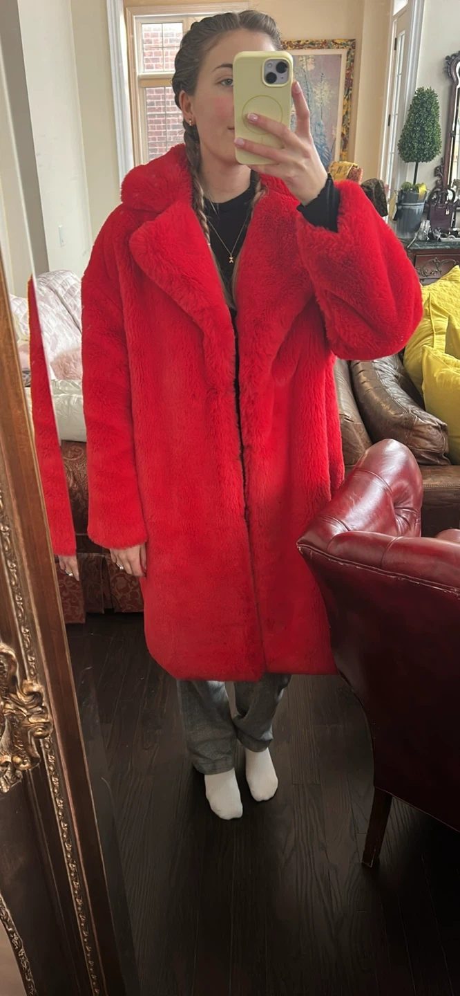 This bright red faux fur coat is super soft and warm. It's a longline style with a classic collar. Looks great for a night out or just to stay cozy!