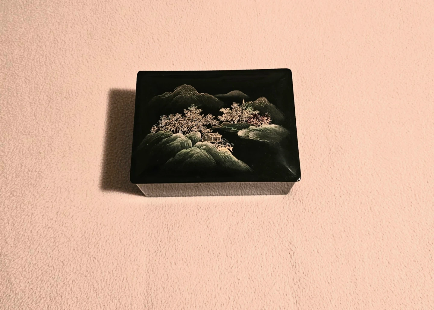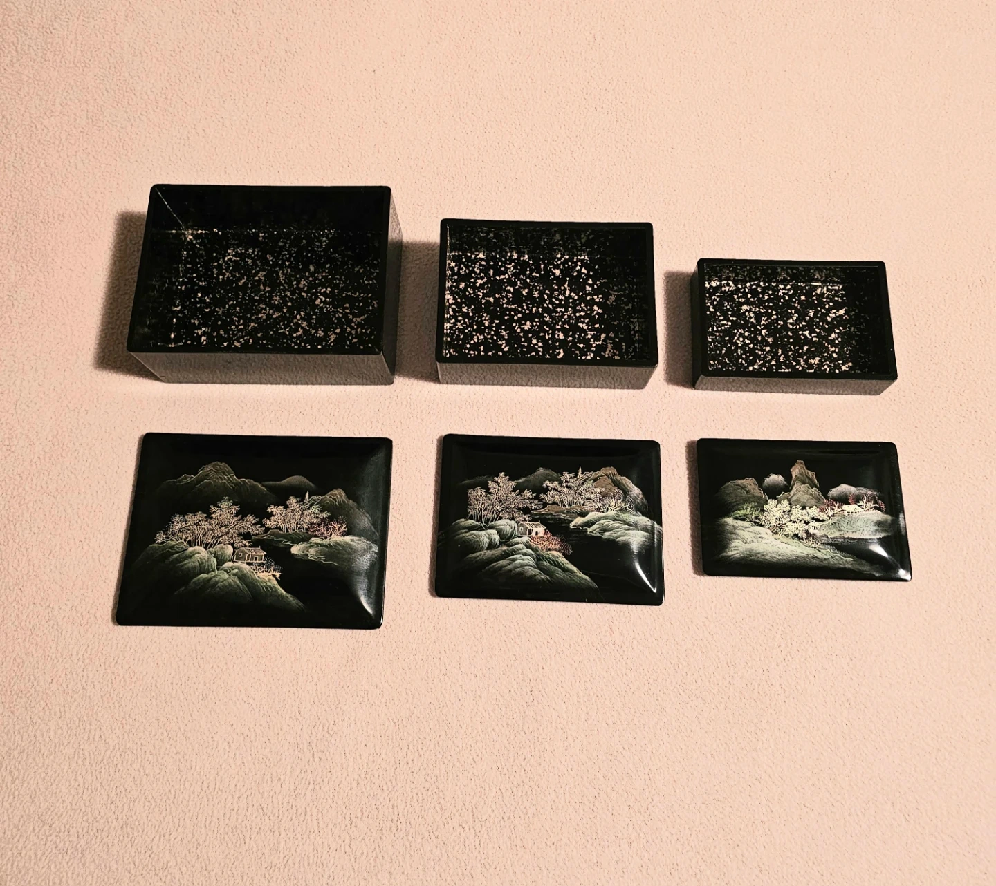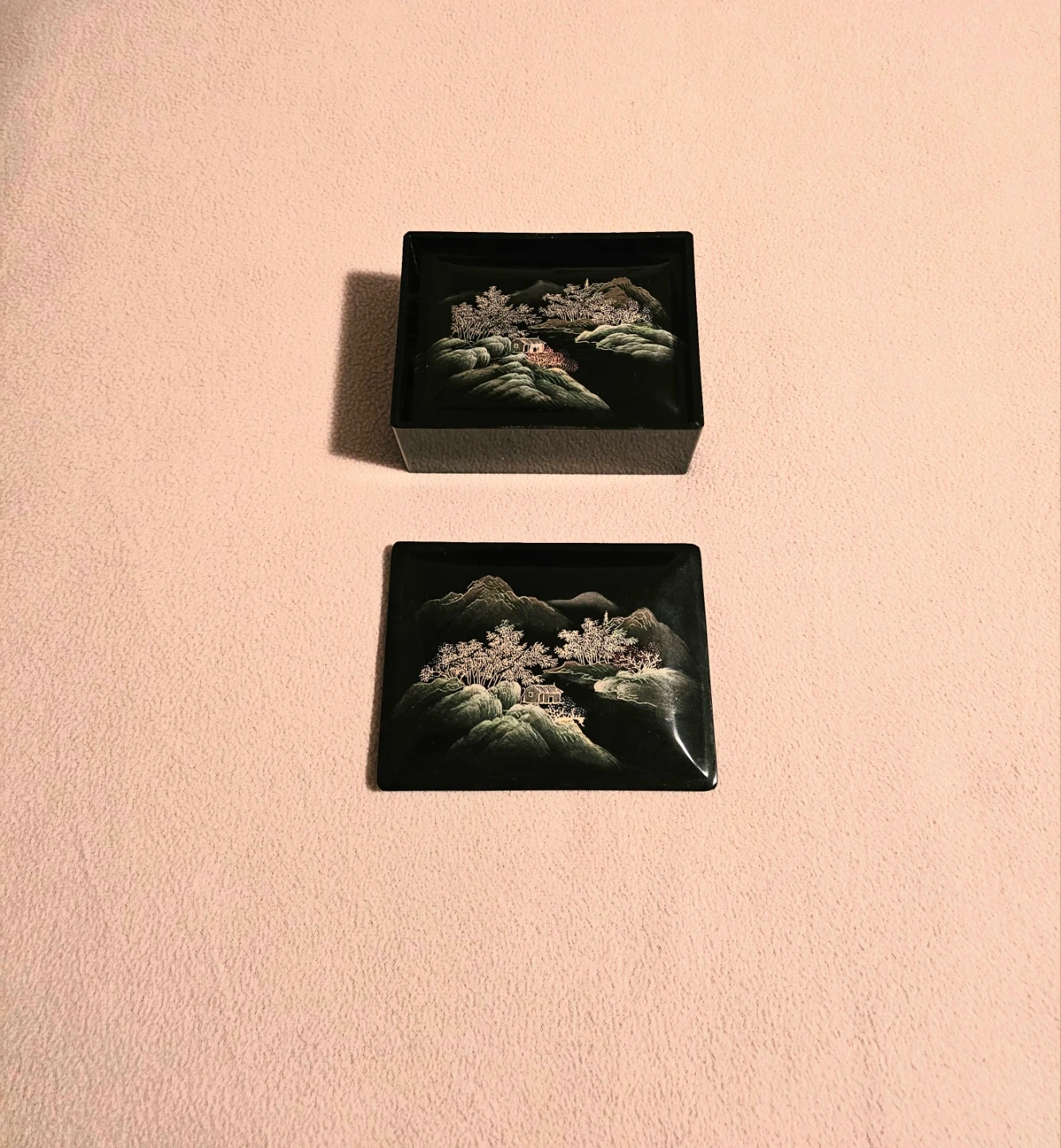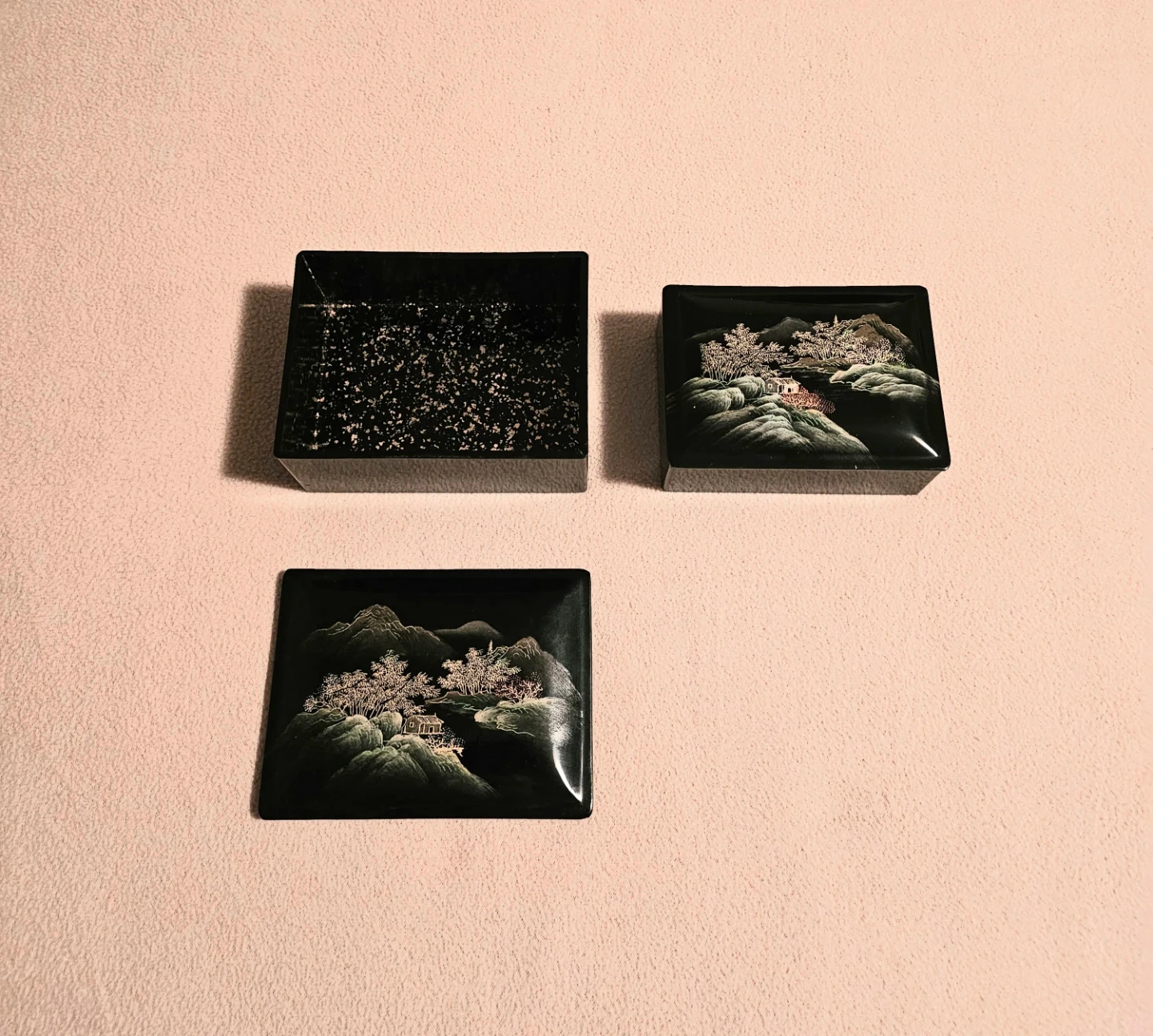 This beautiful hand-painted vintage set includes 3 black lacquer boxes, features a decorative landscape design with trees and mountains. Nesting boxes have speckled glitter interior. They're perfect for organizing small items or as decorative accents, collectible pieces. They offer a touch of elegance to any space! $12