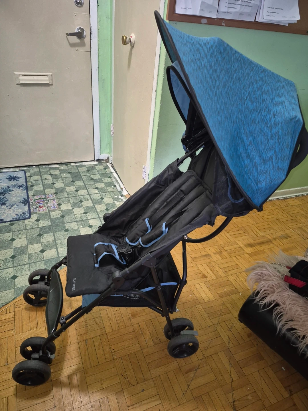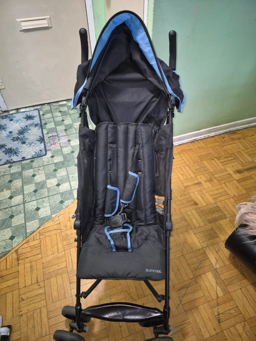 This is a Summer Infant lightweight stroller in black with blue accents. It's designed for easy portability. It features a canopy and a 5-point harness for safety.
