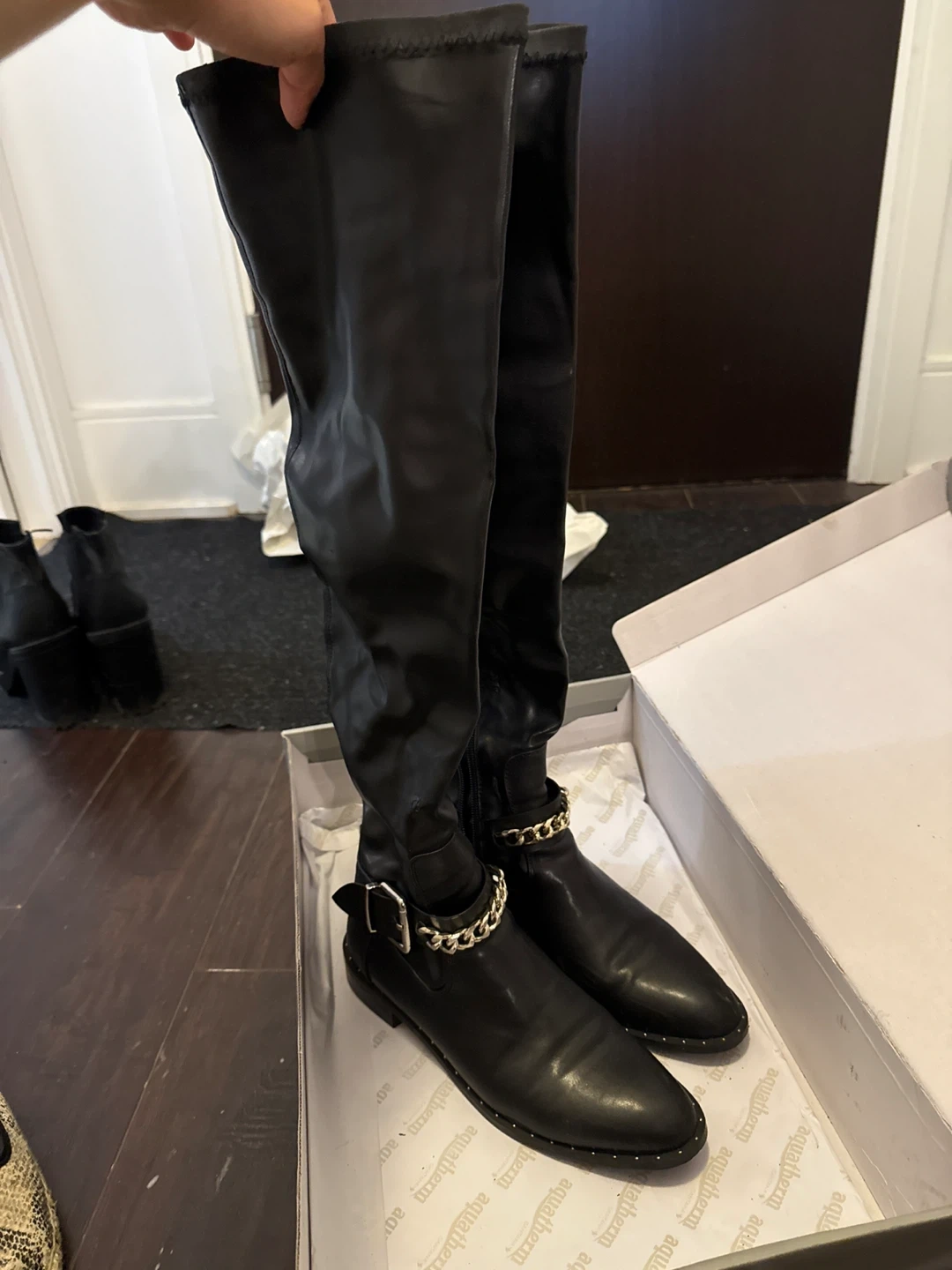 These black over-the-knee boots are super stylish! They feature a chic chain detail and come in a box. Perfect for adding a bit of edge to any outfit