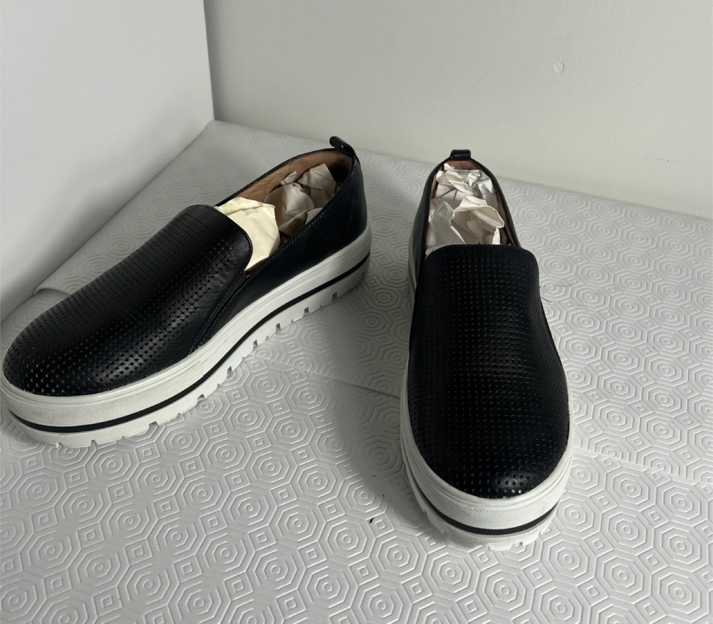 Black slip-on platform sneakers with a perforated design. Genuine leather upper and balance man-made materials. Made in Vietnam.