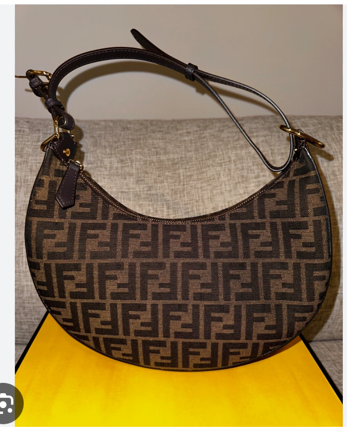 This Fendi Baguette bag features the iconic FF motif. It has a curved shape with a leather strap and gold-tone hardware. Includes original box.