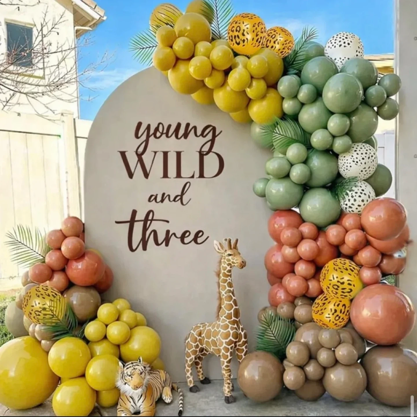 A fun balloon arch with a jungle theme, perfect for a birthday party. It features balloons in yellow, green, terracotta, and brown, with leopard print accents. Includes a cute giraffe figure to complete the display!