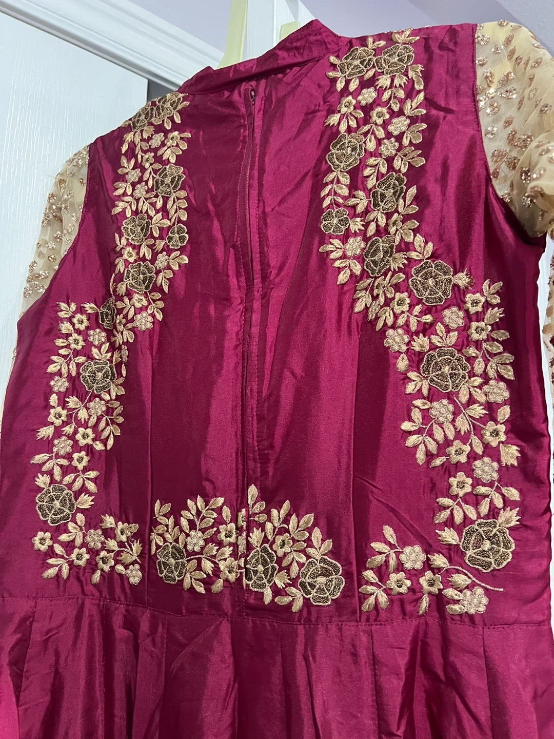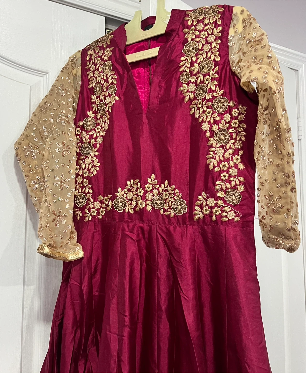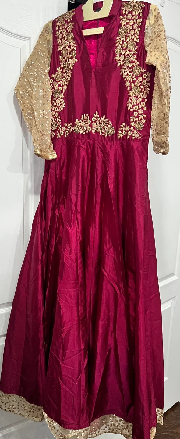 Gorgeous maroon Anarkali dress with intricate gold embroidery on the bodice and sleeves. It features sheer, sequined sleeves and a flowing skirt. Perfect for special occasions or festive events!