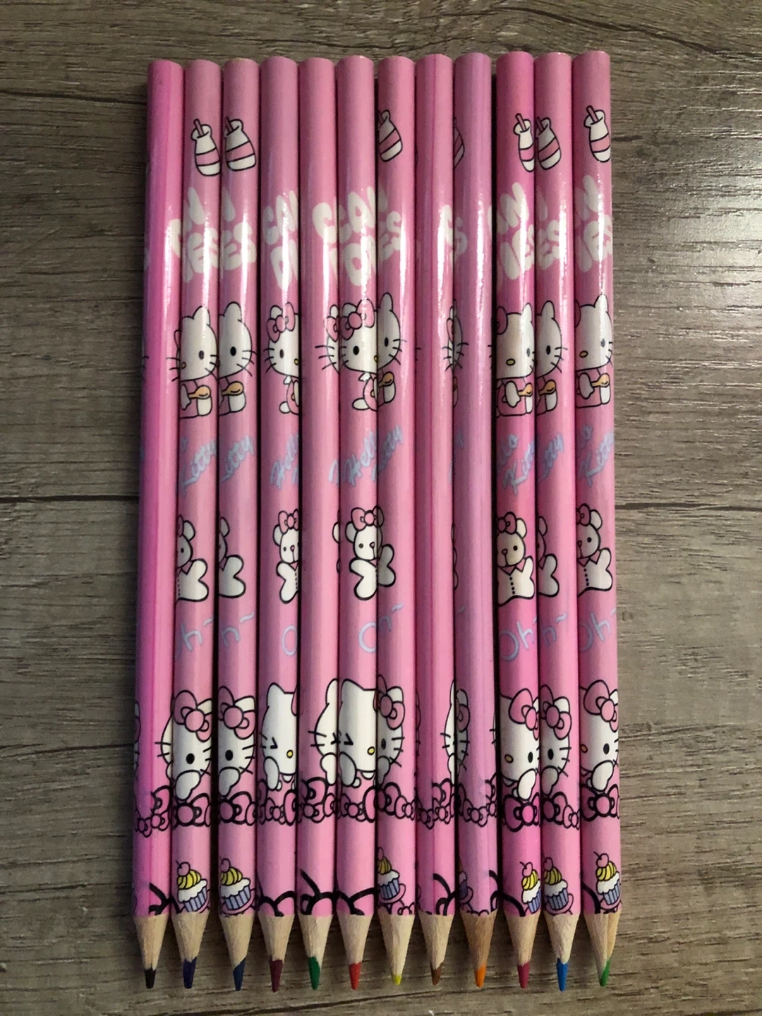 Get these cute Sanrio colored pencils, featuring Hello Kitty, Kuromi, and Cinnamoroll. Each pack includes 12 colored pencils. They're perfect for drawing, colouring, or just adding some Sanrio charm to your stationery collection!