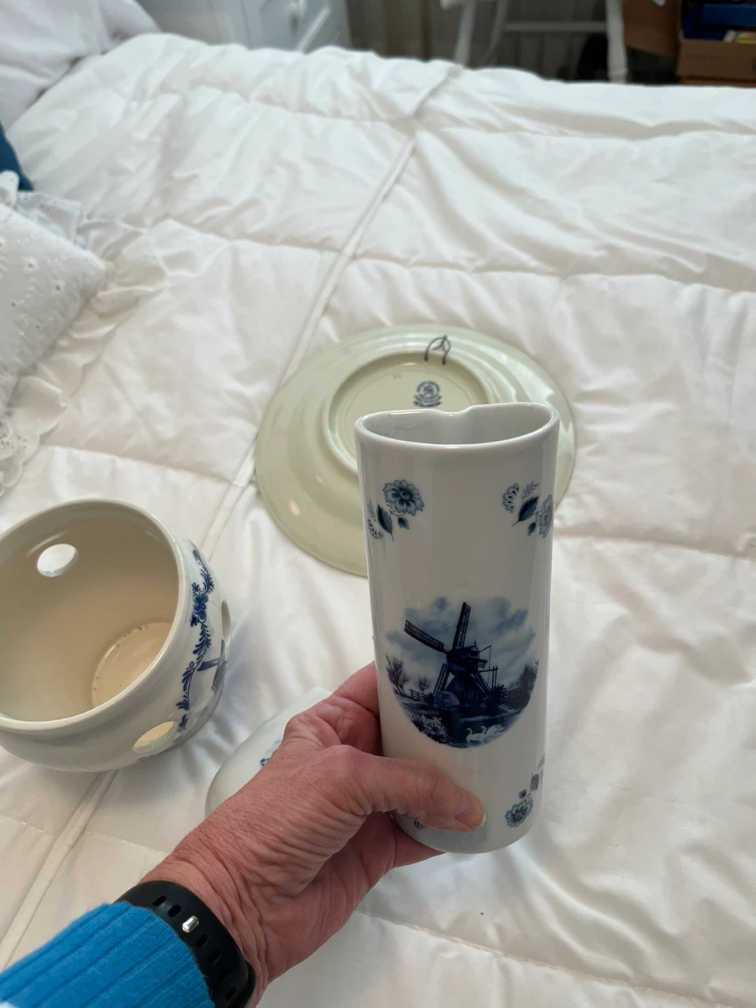 This set includes a decorative plate, a small vase, and a pot, all featuring classic Delft Blue windmill and sailing ship designs. They are made from ceramic in Holland. This collectible ceramicware would add a touch of Dutch charm to any home decor.