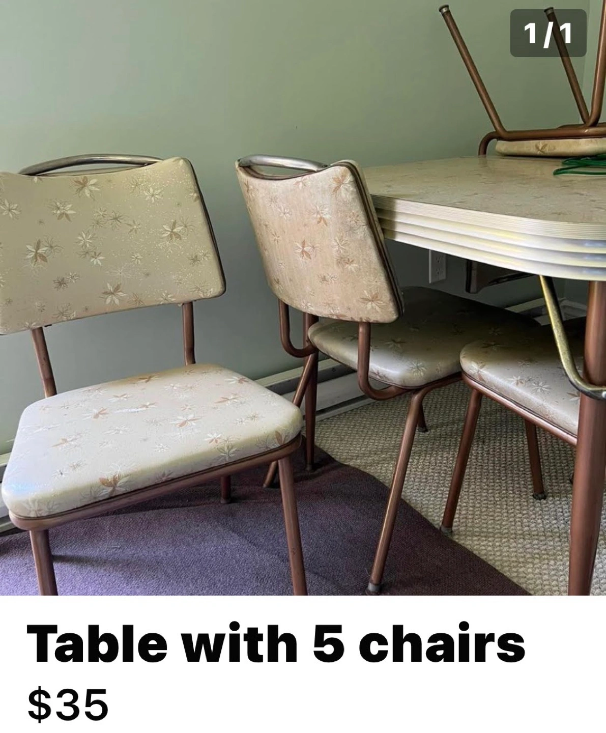 Mid-century modern kitchen table set. Five chairs included. Bronze-toned metal frame. Beige upholstery with floral pattern. Some wear and tear. Cash preferred upon pickup. Thanks for looking!