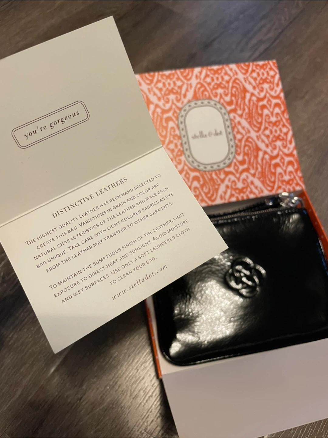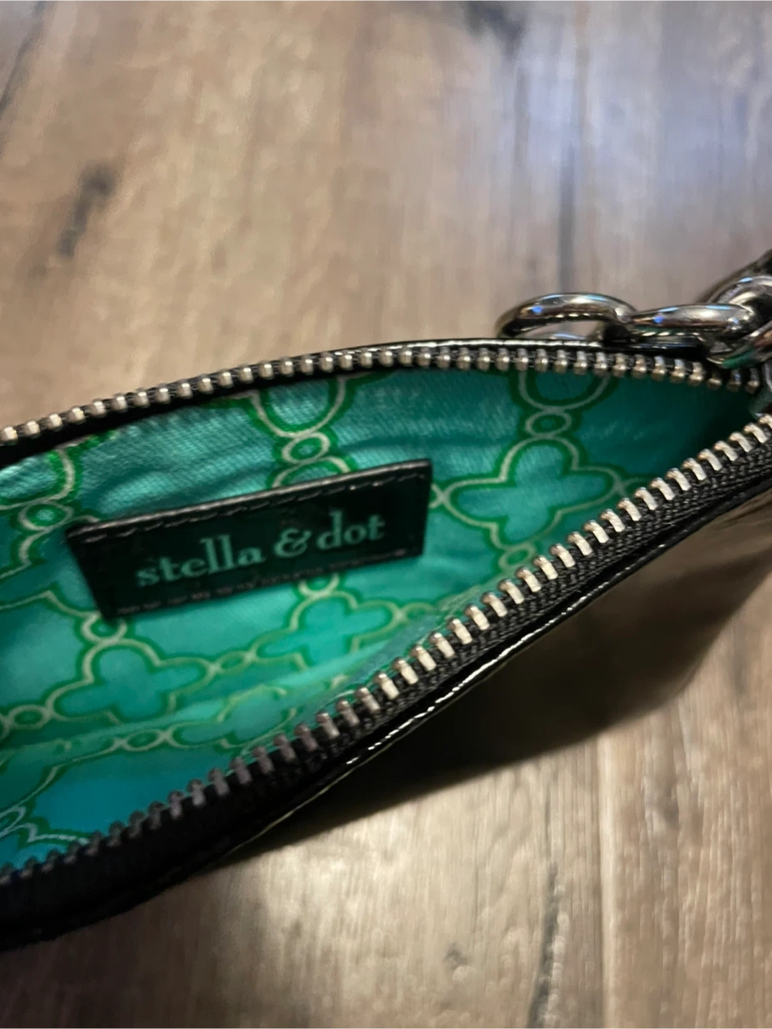 Downsizing my accessories closet. Add chic to any outfit with this Stella & Dot Soho wristlet clutch made from crinkle black patent leather. It features a zippered closure, a shiny nickel clover pull and a convenient wrist strap. Magnificent wristlet featuring a vibrant teal interior. It is in new condition. Includes the original box and care card. Original retail price $74. Sleek design & gift ready. Approximate dimensions 4.5 in x 6.5 in.