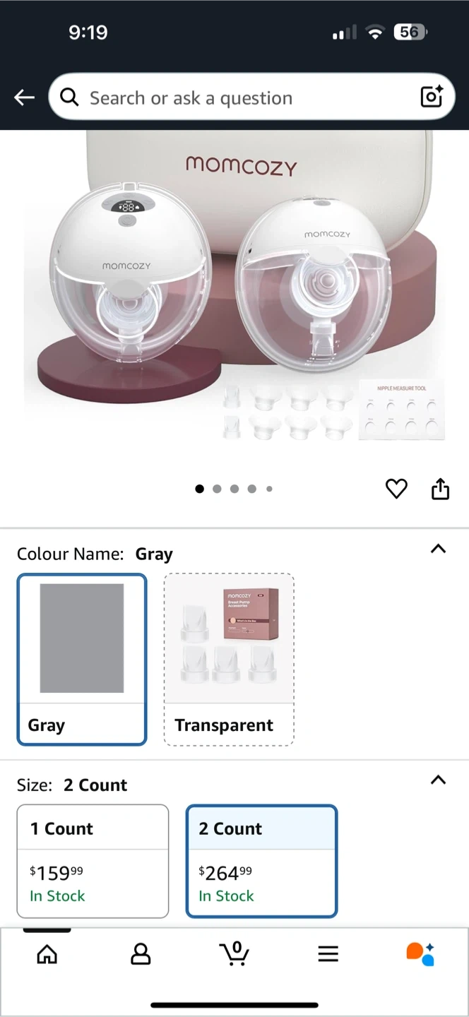 Selling a Momcozy M5 Wearable Breast Pump, which comes with two pumps. It's in gray and transparent. This set is great for hands-free pumping.
