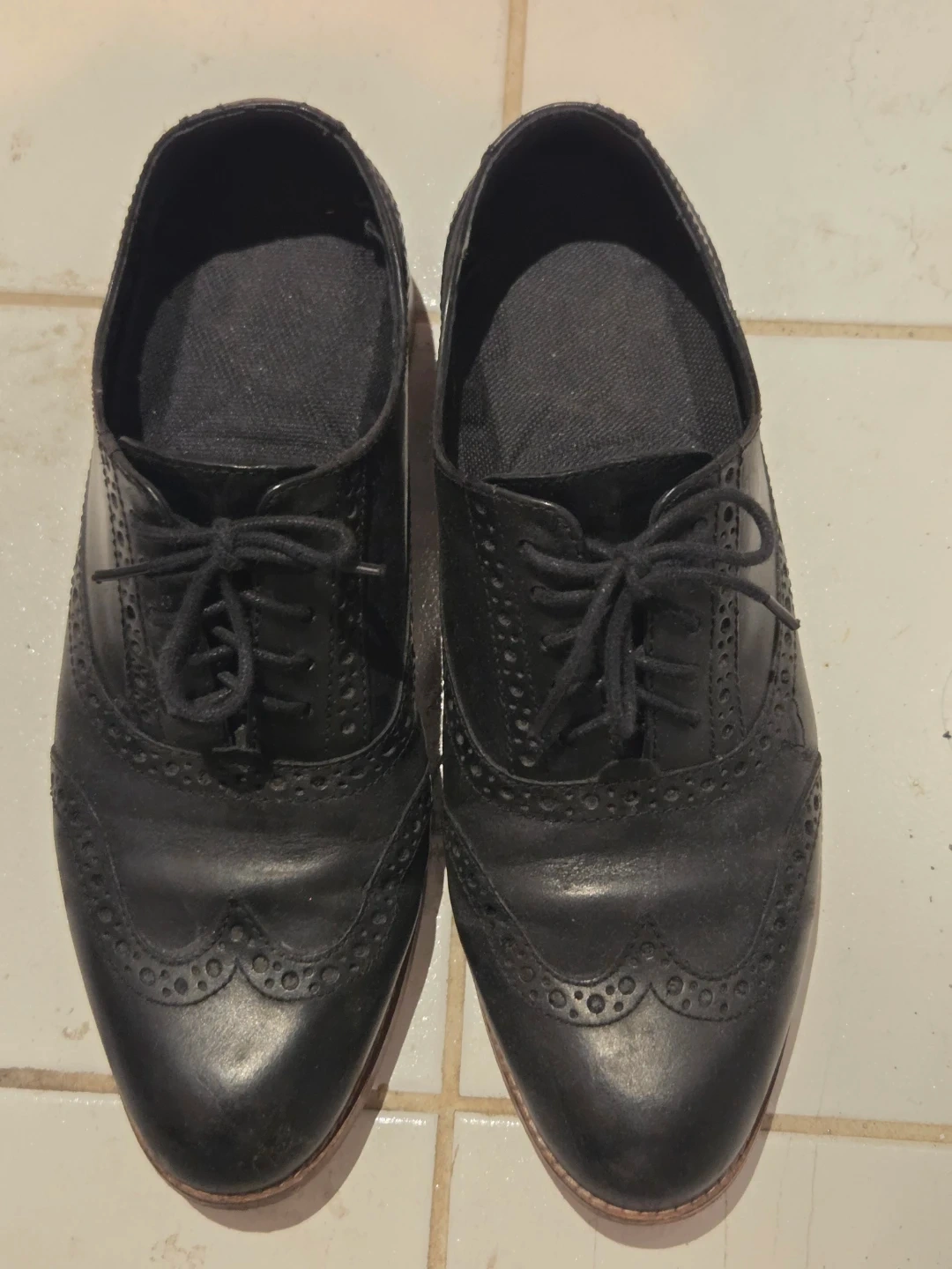 Classic black leather wingtip brogues for women. These shoes feature intricate broguing detail and a lace-up closure. They're made of genuine leather with a durable sole.