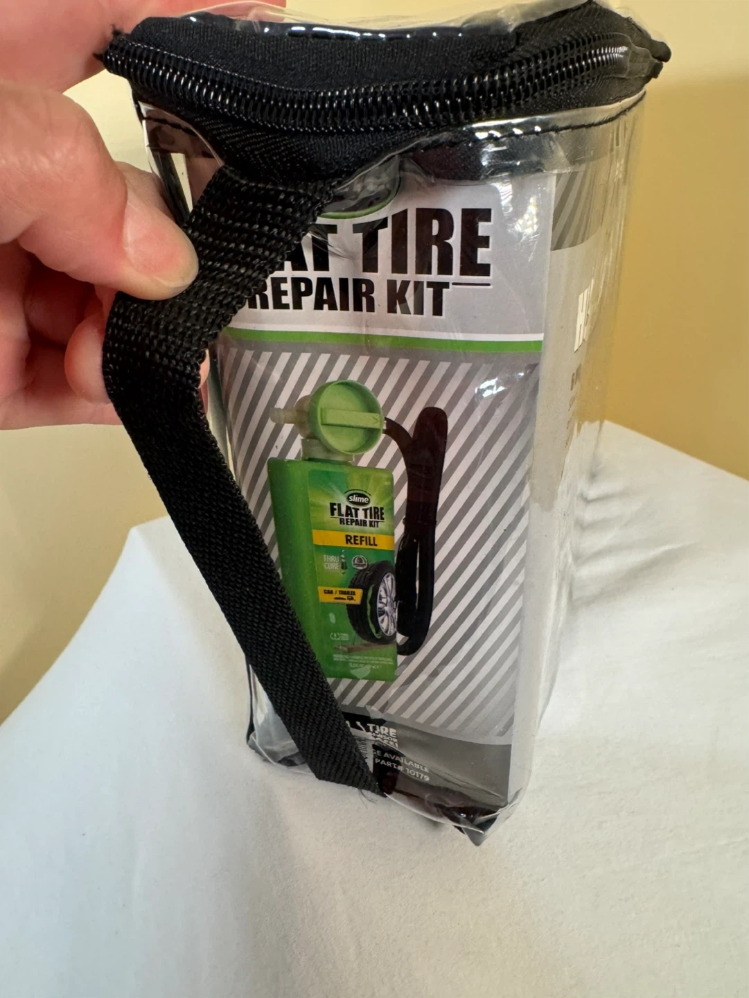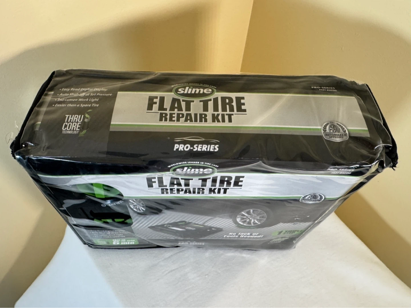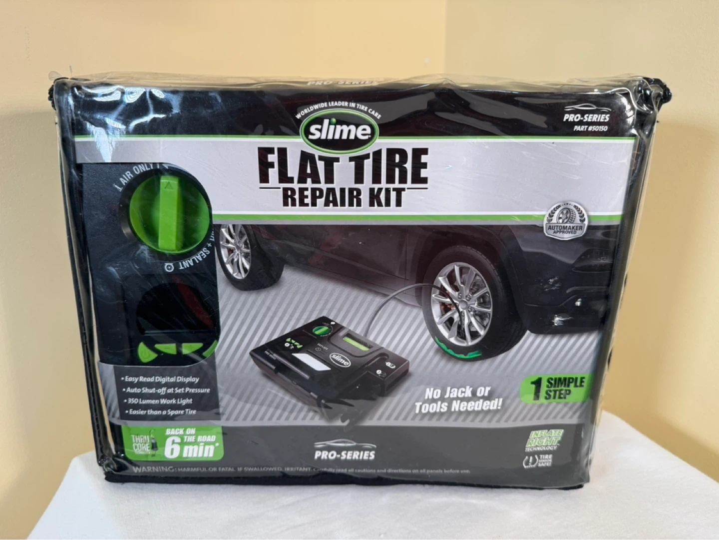 This Slime Pro-Series Flat Tire Repair Kit offers a quick fix for flat tires. It includes a tire inflator with an easy-to-read digital display and a 350-lumen work light. No jack or tools are needed for this repair!