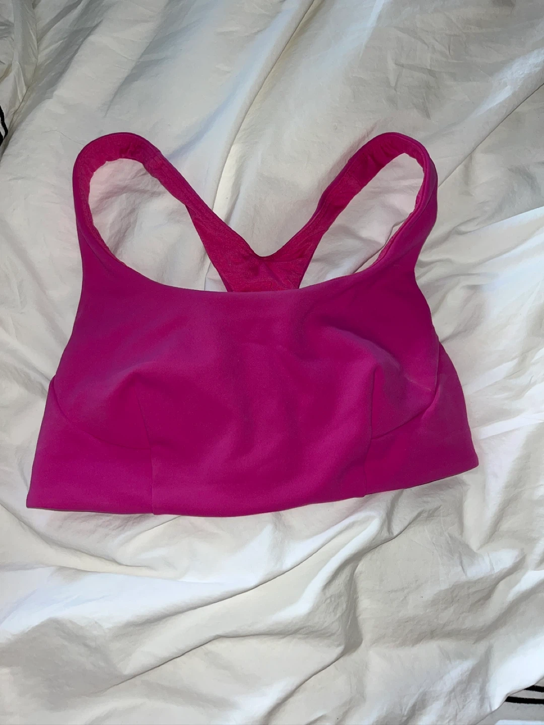 This is a Lululemon sports bra in a vibrant pink colour. It features a racerback design for support during workouts. Made from a comfortable, breathable fabric.