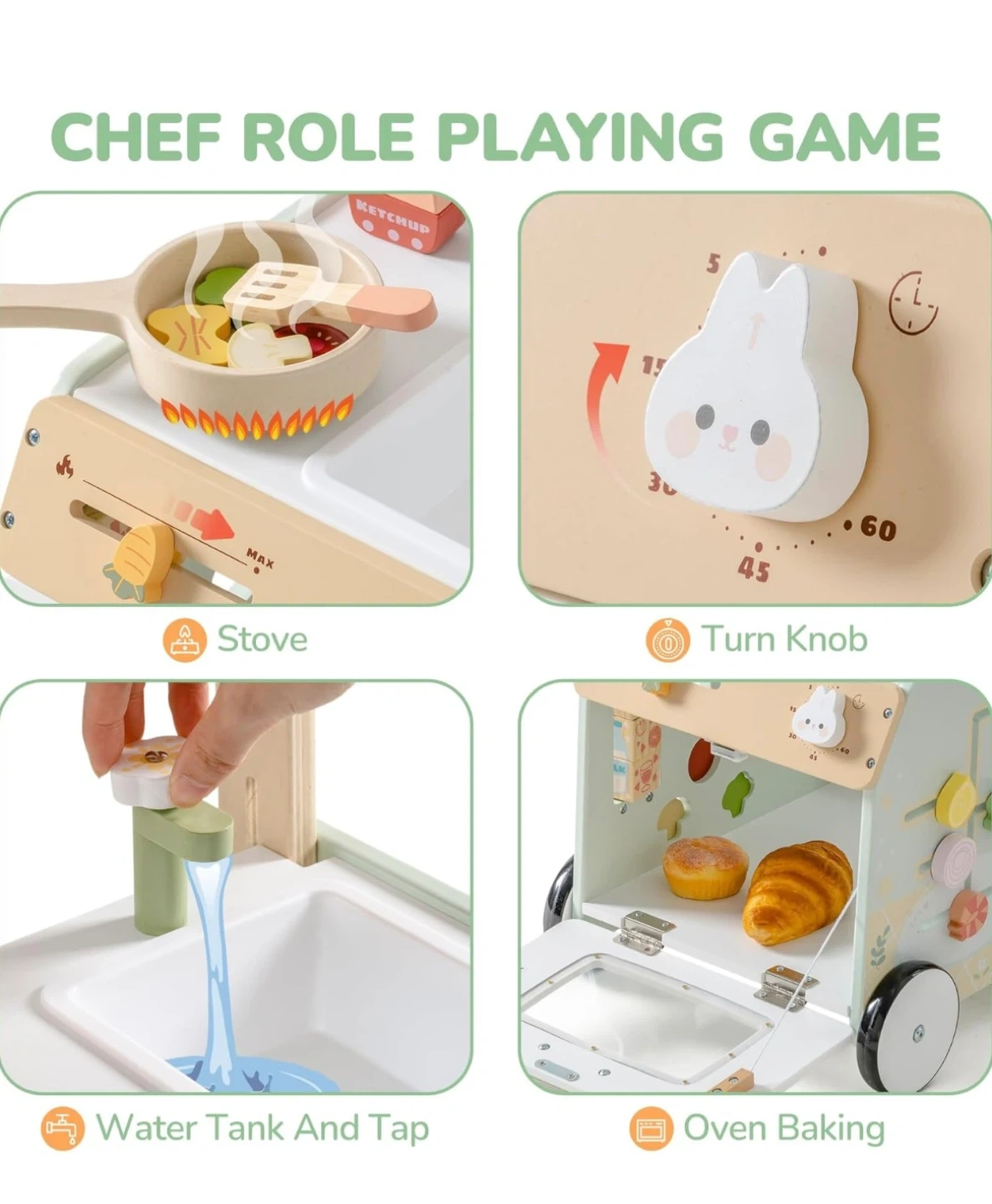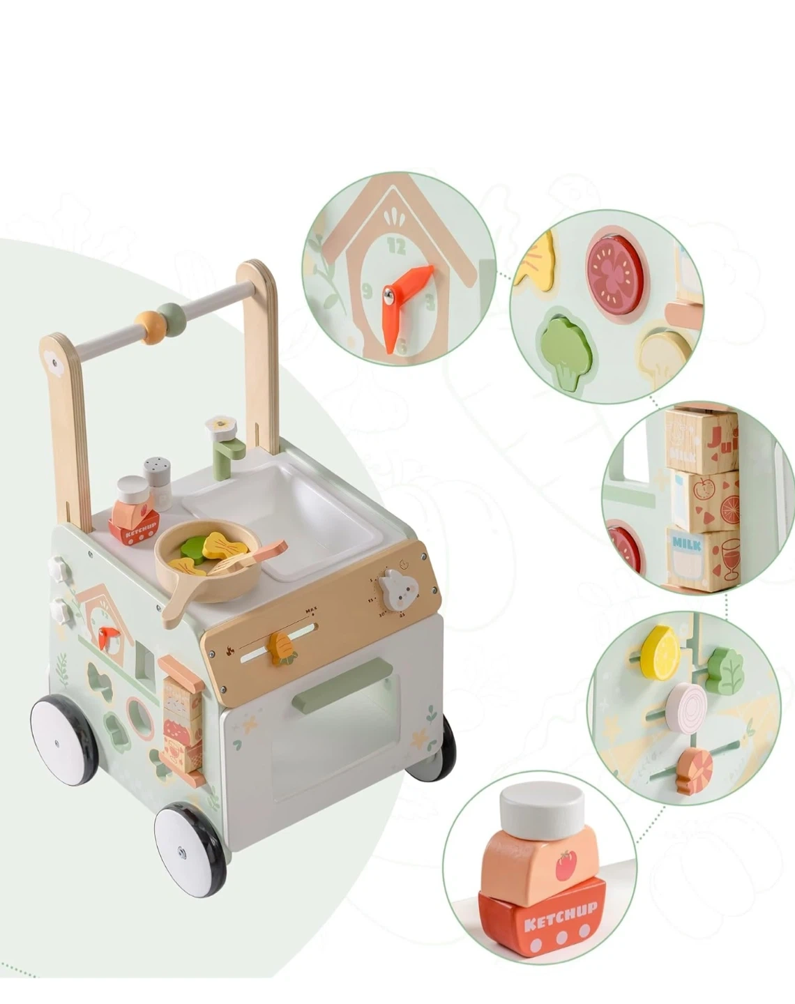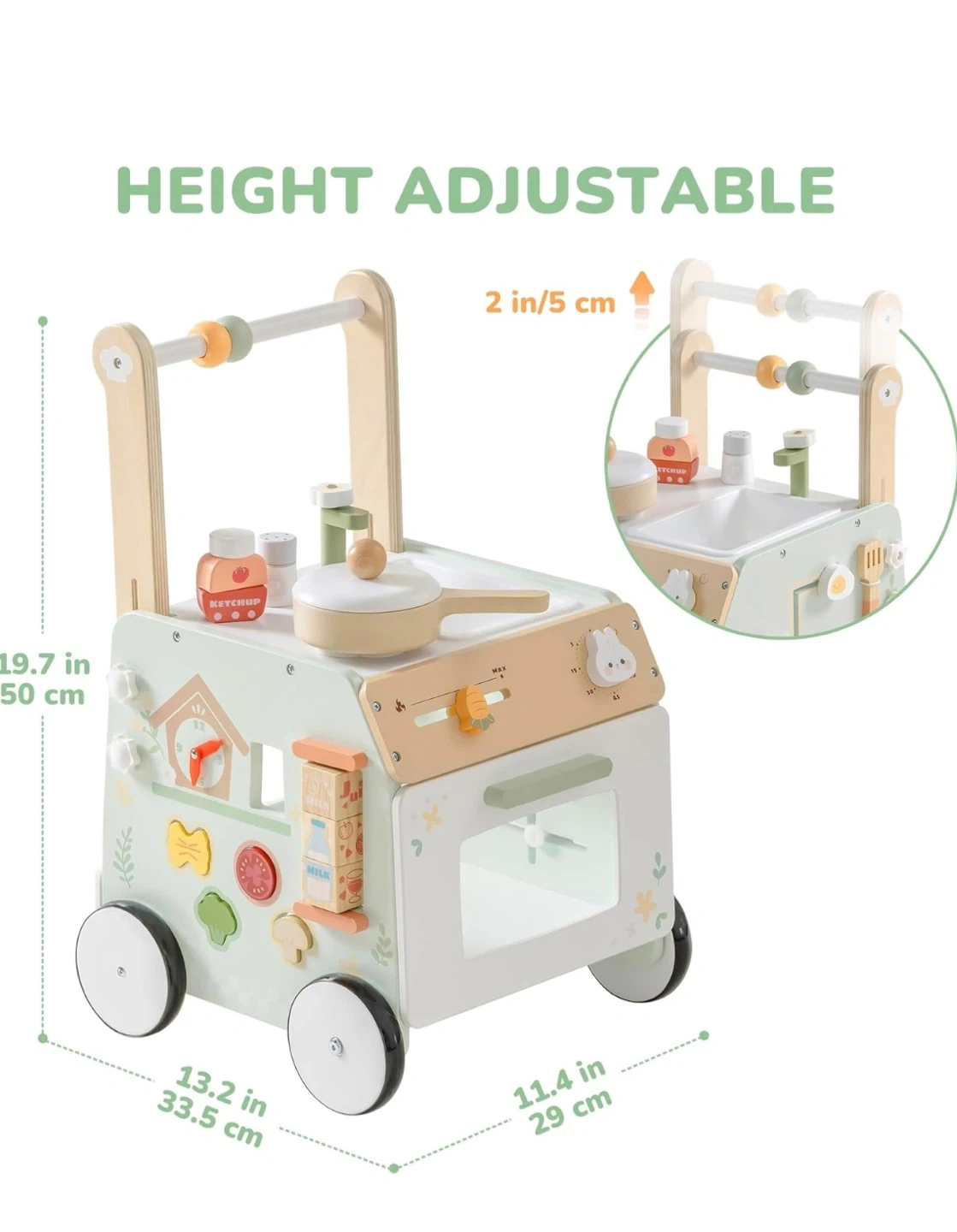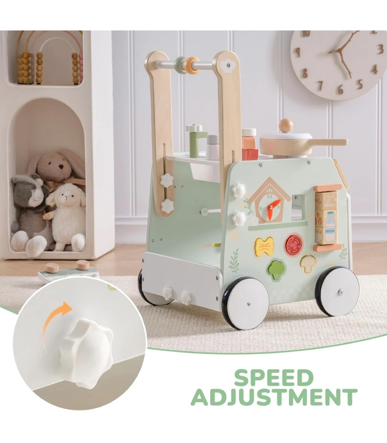 This wooden baby walker activity center offers a variety of engaging activities. It's designed to help prevent O-legs and features speed adjustment for safety. It also includes ample storage space for toys and accessories.