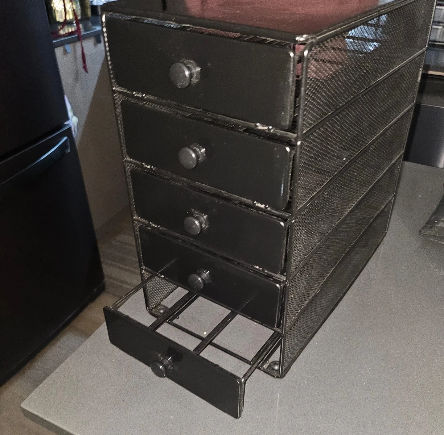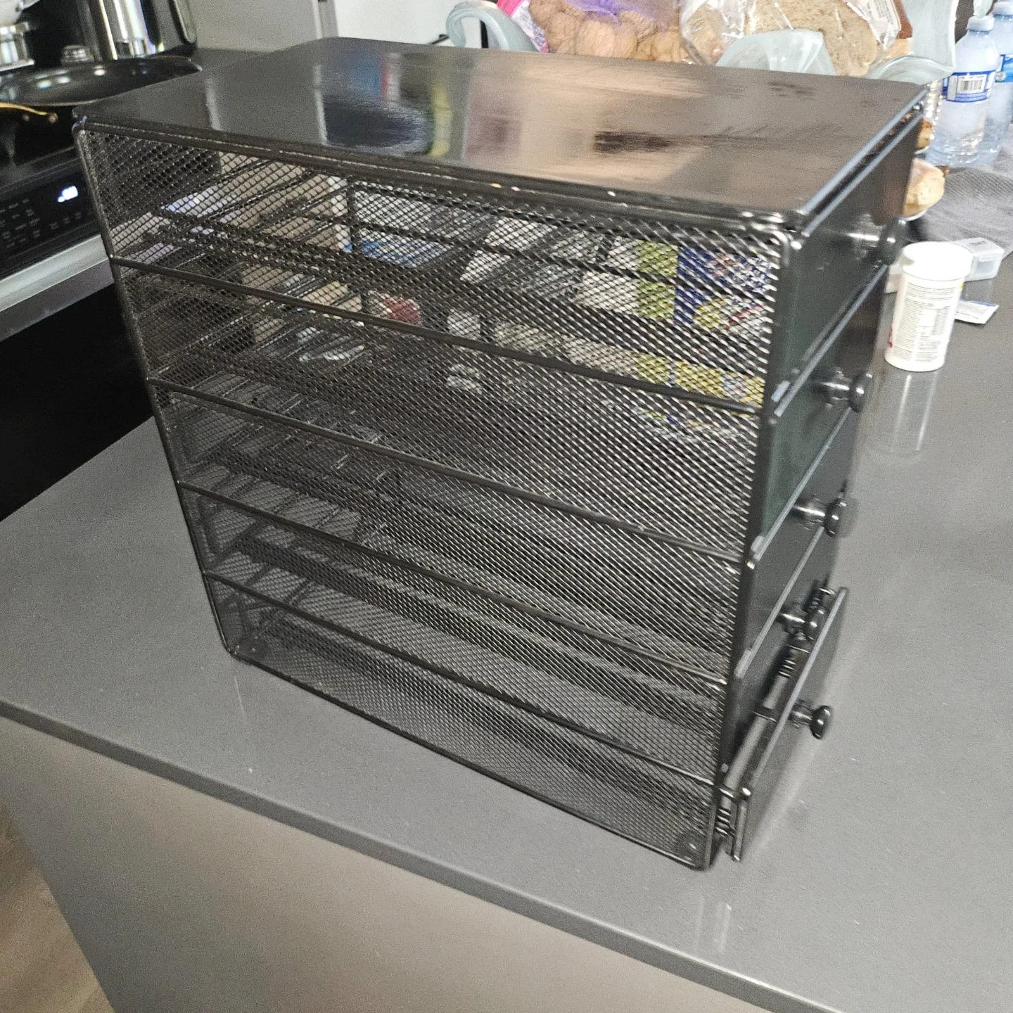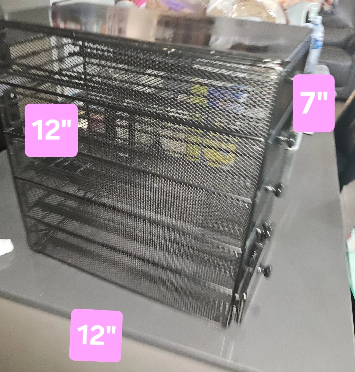 Black mesh desk organizer with five drawers. It's 12 inches wide, 12 inches deep, and 7 inches tall. This organizer is great for keeping your desk tidy!
