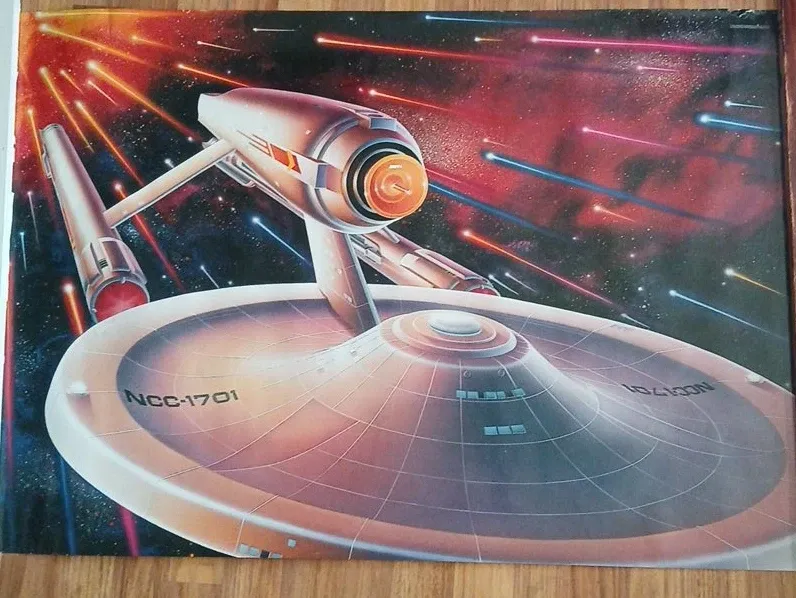 Poster featuring the iconic Starship Enterprise NCC-1701. It's depicted in space with phaser fire and warp trails. This art piece is a must-have for any Star Trek fan's collection. It's a great conversation starter!