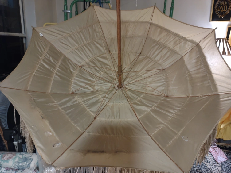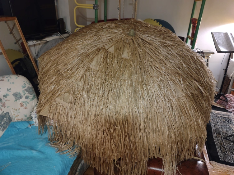A vintage parasol. Features a round canopy made of long strands of wicker , ( straws ) A good way to feel relaxed, while enjoying some shade on a sunny day.